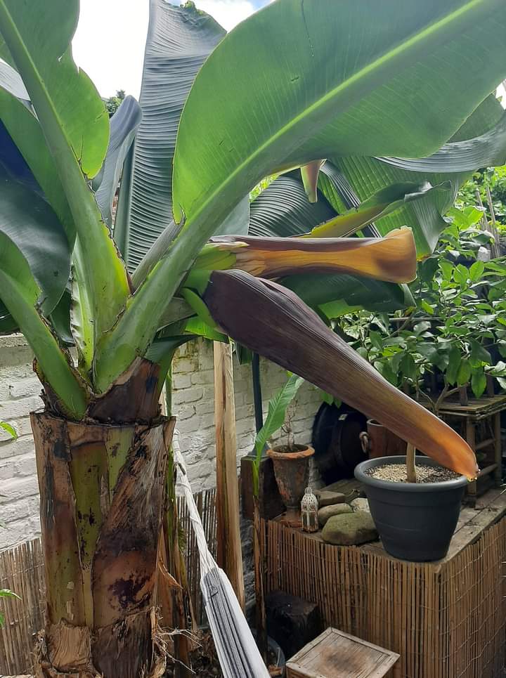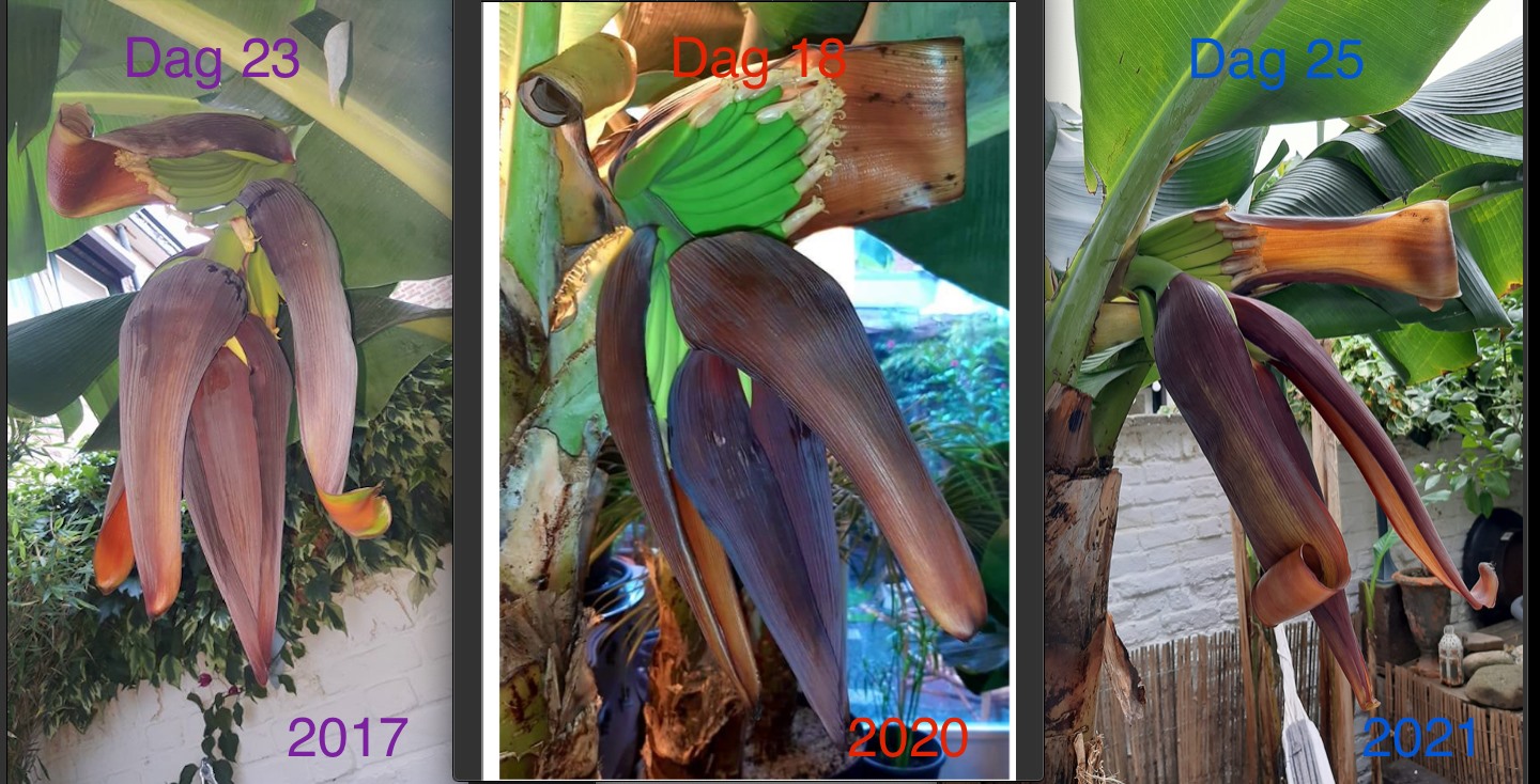 Op de foto te zien 1x bloem, 2x bananen en later in het seizoen nog 2 trossen gok ik..
