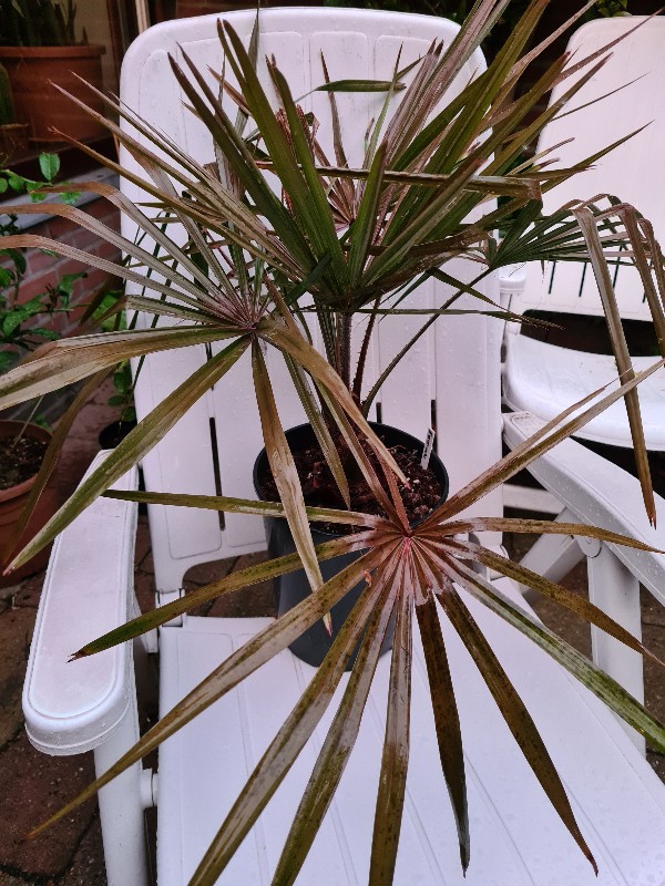 Die palm - net als de twee die hier staan (vrijwel helemaal groen, maar vorig jaar in de tuin wel significant rood) is gekocht als L. decipiens. Inmiddels is L. decipiens hernoemd naar Livistona decora.
