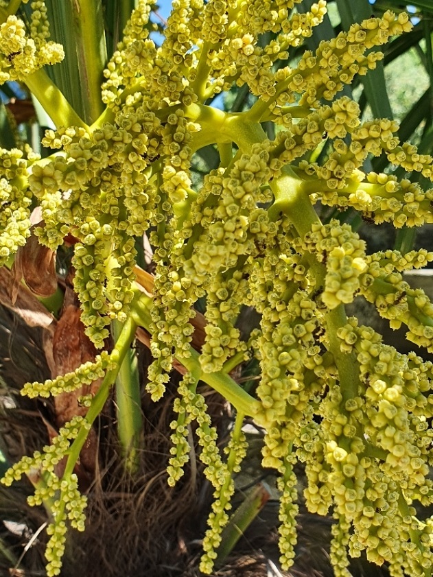 De bloemen van de Trachycarpus fortunei gaan nu snel!