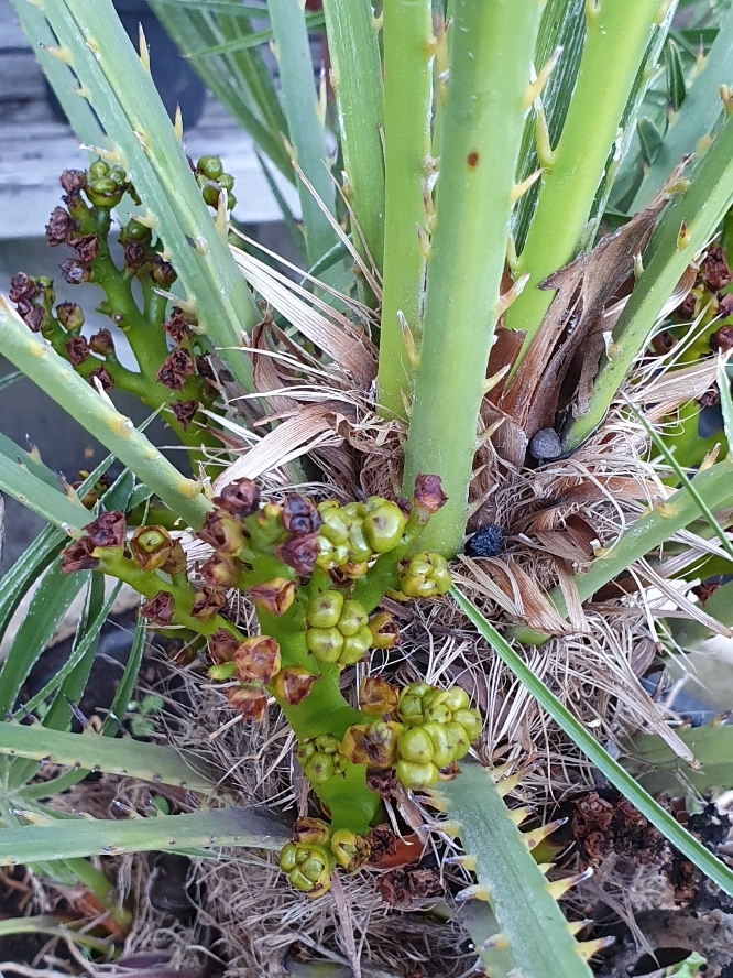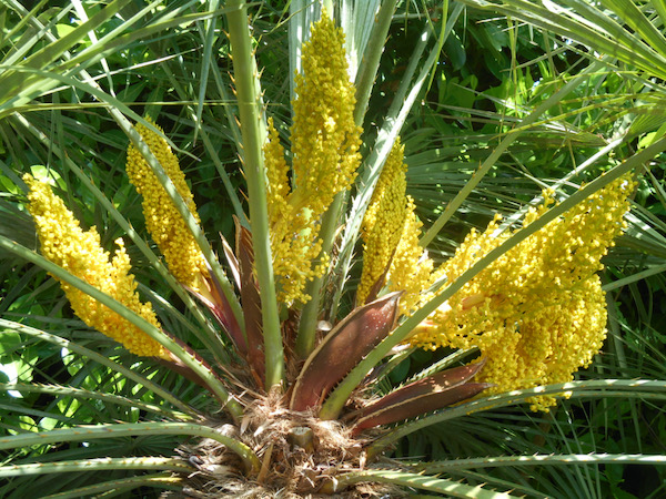 Chamaerops humilis vrouw en man (Cerifera) staan naast elkaar en bloeien nu tegelijk. Ik ben benieuwd of er spontane bestuiving zal plaatsvinden.