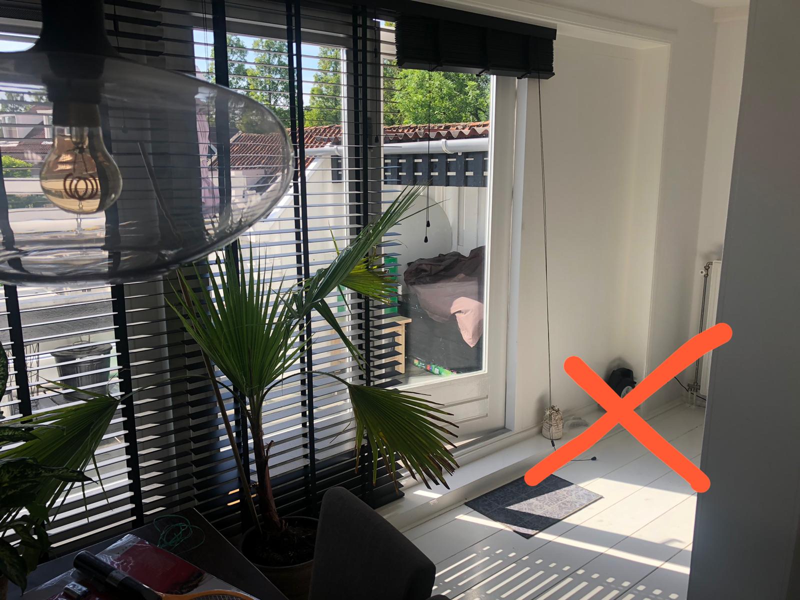Toen ik hem ontving heb ik hem meteen in een grotere pot gezet met speciale palm grond. Ook wat hydrokorrels onderin. Hij stond eerst naast de deur (rode kruis), maar ik heb de deur vaak op een kier staan en las dat hij niet zo goed tegen de wind kan, dus nu even verplaatst. De ramen zijn op het zuid-westen, dus genoeg zon (lijkt me). Het kan vrij warm worden in huis.