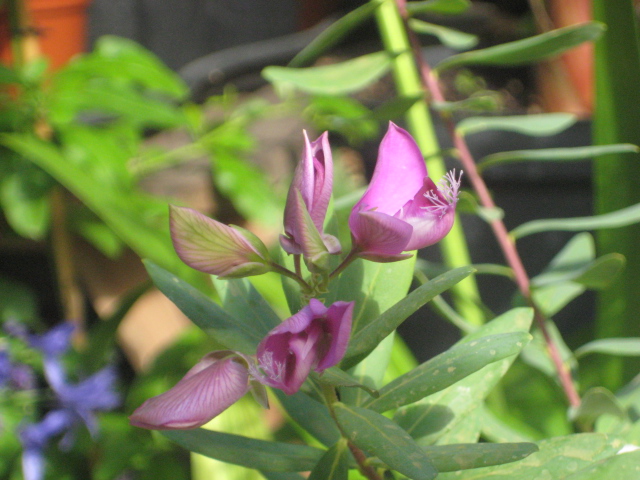 Dat is een polygala myrtifolia , een heel gemakkelijke kuipplant die ook enkele graadjes vorst aankan. Dit jaar heb ik hem aangeplant in de tuin, ben benieuwd na de winter ( zal wel beschermd worden. Bloeit zowat de ganse zomer, en in de winter vaak ook..
