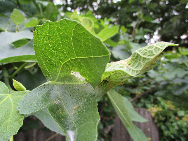 Na veel getwijfel en ge-google toch uitgekomen op rupsen (van een vlinder/mot). Inmiddels veel gelezen en foto's vergeleken/bekeken van de beestjes, (b)lijkt het te handelen om de "vijgenskeletteermot". Een erg logische uitkomst, daar immers juist mijn vijgenboom onder zit. De naam van het beestje belooft niet veel goeds, ik zal dus toch maar voor bestrijding moeten gaan met de juiste ingrediënten (pyrethrum) tegen deze rupsen.