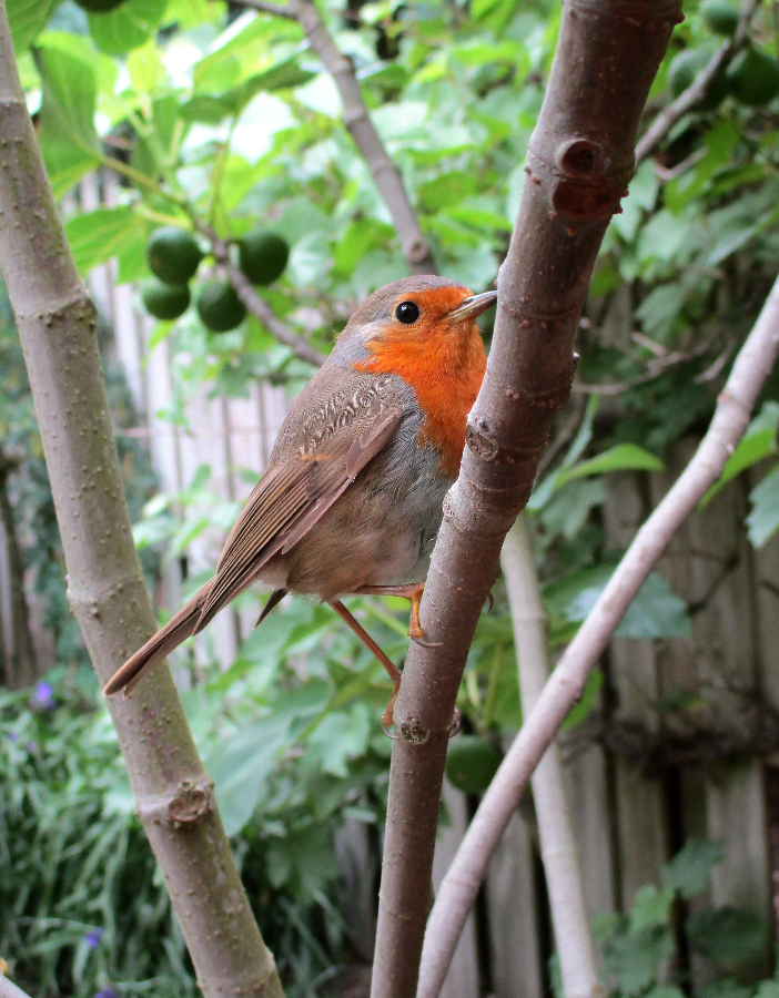 Roodborstje met palmen op achtergrond en even poseren in een trachy.
