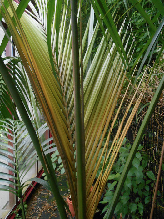 Mijn kamerpalmen zijn van een formaat dat nog goed is te verplaatsen. De Howea parkeerde ik tot nu toe 's winters op de eerste verdieping in de logeerkamer maar dat red ik niet meer sinds die in een grotere kuip staat. Verpotten was hard nodig. In de kas overwinteren is nu de enige optie. Het huis heeft weliswaar een lichte hoge vide (oranjerie) maar daar mogen geen planten staan. De kasverwarming moet in het vervolg dan hoger worden ingesteld (> 5°C). De ervaring heeft me geleerd dat zone 9 palmen niet langdurig een temperatuur nabij het vriespunt kunnen verdragen.