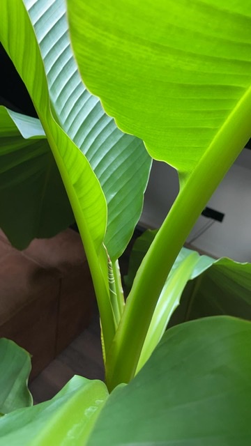 Zijn huidige standplek is denk ik te donker voor een banaan, en dat veroorzaakt ook het wat hangende blad m.i.