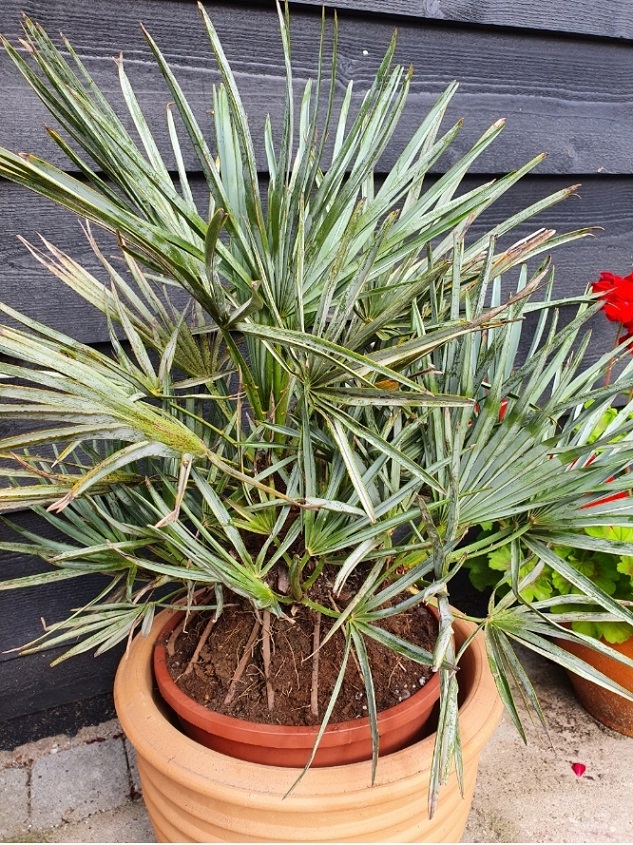 De potten waar palmen in worden gekweekt zijn meestal standaard maten terwijl een diepe kuip de voorkeur verdient. Palmpotten zijn dieper dan breed. Of de palm al geruime tijd in deze pot staat weet ik niet, het kan ook zijn dat die er recent is ingezet en de Chamaerops in de volle grond is gekweekt?. Je zou eventueel de kluit daarop kunnen inspecteren.