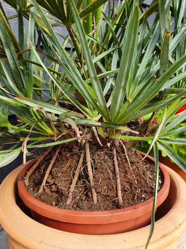Het lijkt me toch beter om de palm dieper te zetten Peter. Nieuwe wortels ontspruiten nu in de lucht waardoor de uitgroei kan stoppen. Het probleem met Chamaerops is dat ze uitbundig wortels maken waardoor de kluit omhoog wordt gedrukt. Deze jonge plant mag best in een diepere pot staan. Uiteindelijk moet je accepteren dat bij het groter worden de wortels erboven uitkomen. Chamaerops humilis var. Humilis barst hier letterlijk uit z 'n 110 liter kuip. De 'argentea' daarentegen gedraagt zich voorbeeldig maar of je daarop kunt vertrouwen?