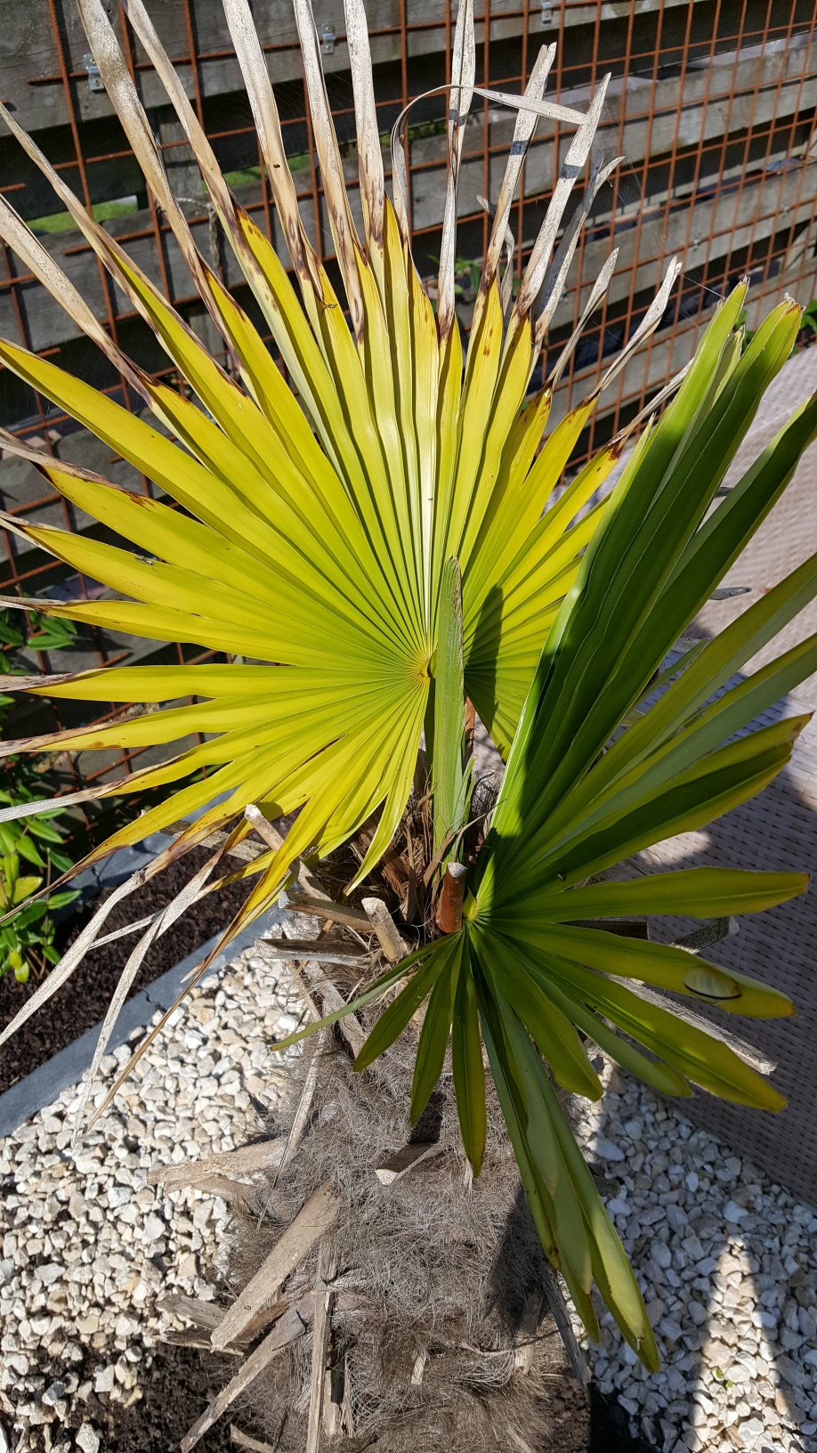 Ik denk dat de Trachycarpus bij het verplanten flink te lijden heeft gehad aan de wortels.