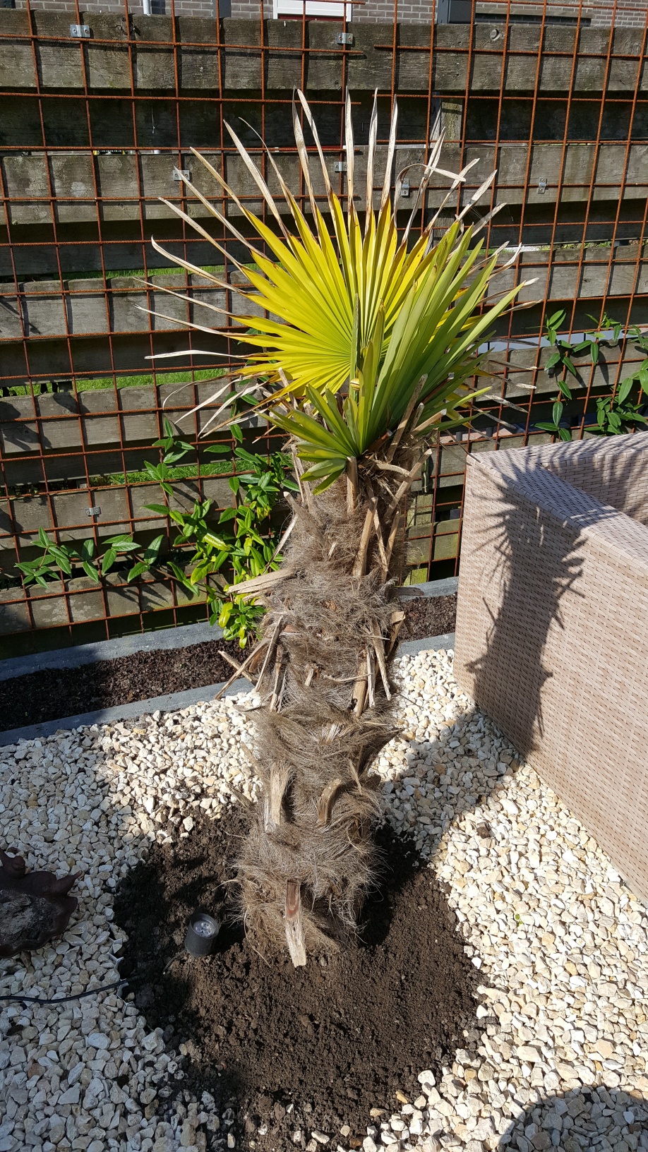 2 jaar geleden hebben we onze Trachycarpus fortunei verhuisd naar onze nieuwe tuin. Ondanks dat het toen 30 gr was bleef hij het goed doen. Tot dit jaar...
