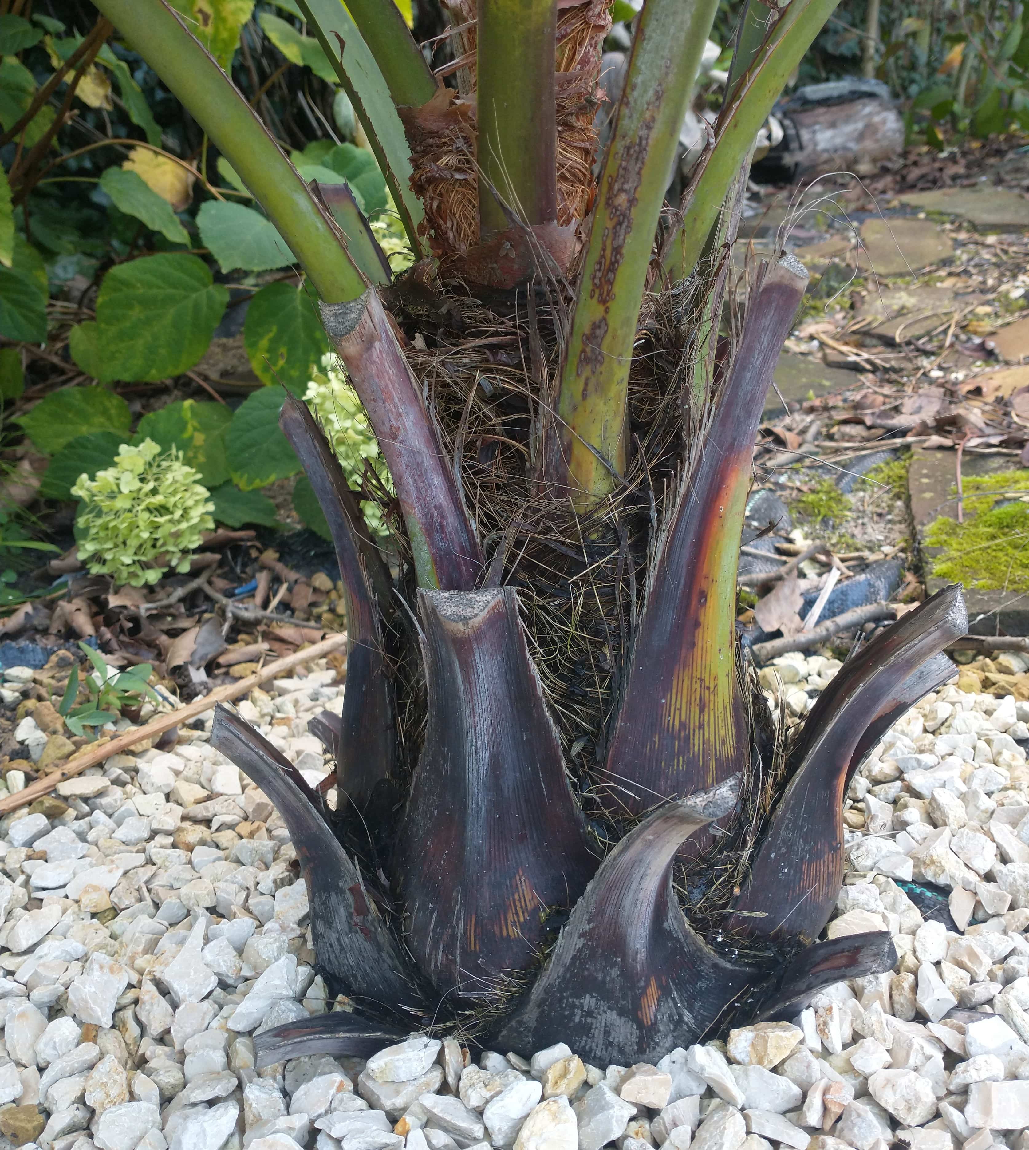 De winters komt deze palm hoe koud en nat het ook is geweest onder een afdakje van bamboestokken en bubbeltjes folie (niet helemaal dicht) probleemloos door..