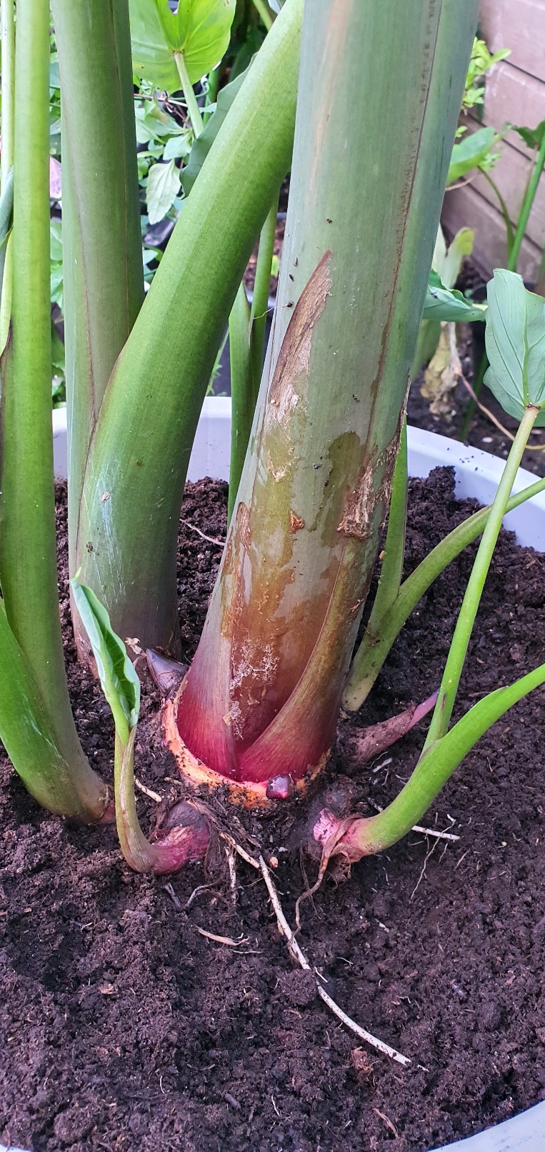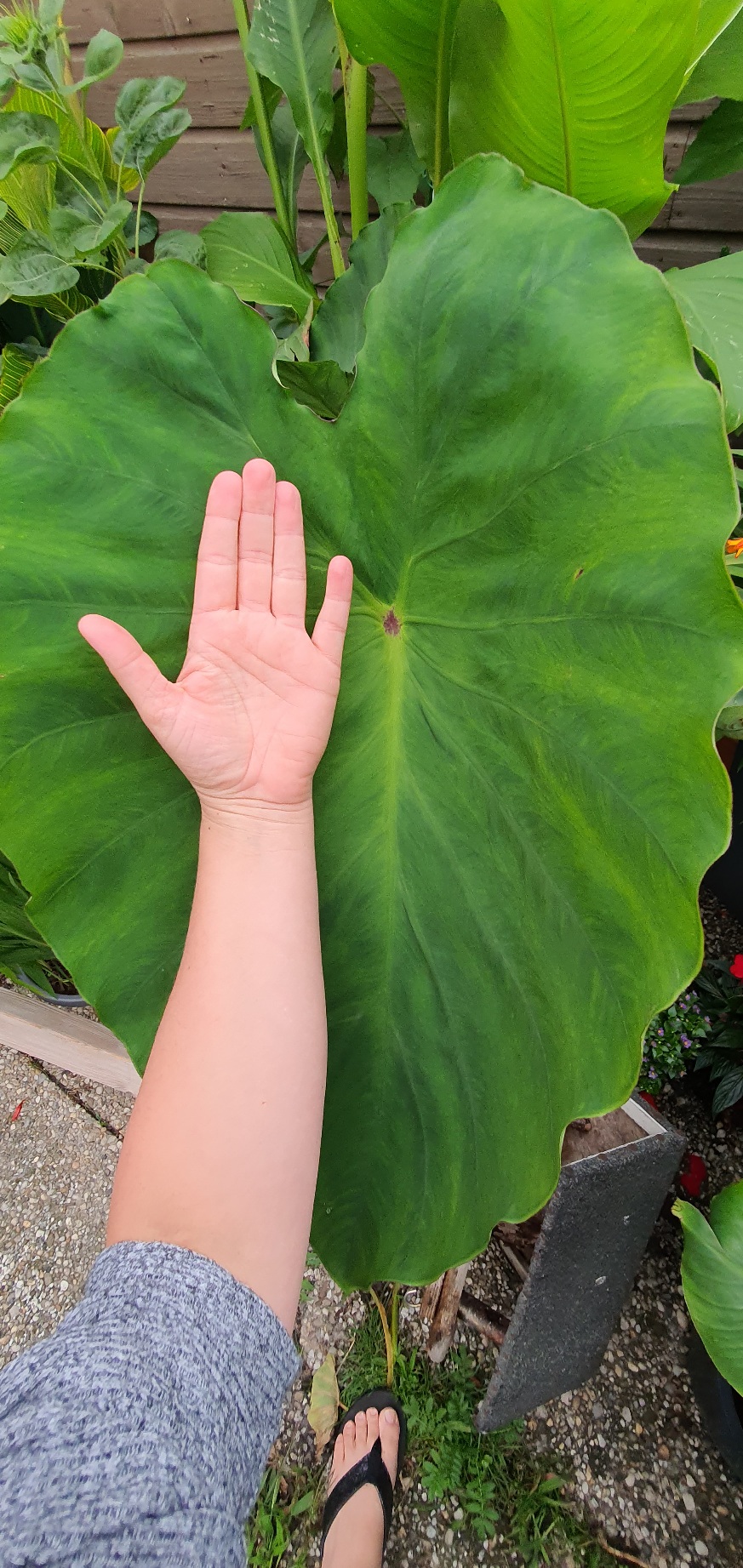 Vorig jaar 3 knollen gekocht uit Thailand. Ondersoort onbekend, hij is wel redelijk groot van blad maar ik denk niet dat het de Jack's Giant is. Ik heb er nog 1 in een pot staan die wel binnen kan. Is wat kleinere pot en minder groot van plant. Er staat er 1 in de grond en die moet ik wel gaan opgraven vrees ik.