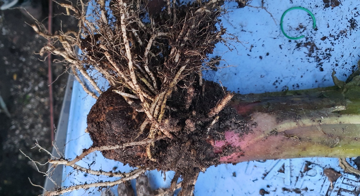 Zojuist het exemplaar die in de volle grond staat eruit gehaald. De knol is helemaal zompig dus dat wordt niet overwinteren als knol. Ik denk dat ik de rotte knol eraf snij en toch probeer op te potten. Beetje tegen beter weten in vrees ik.