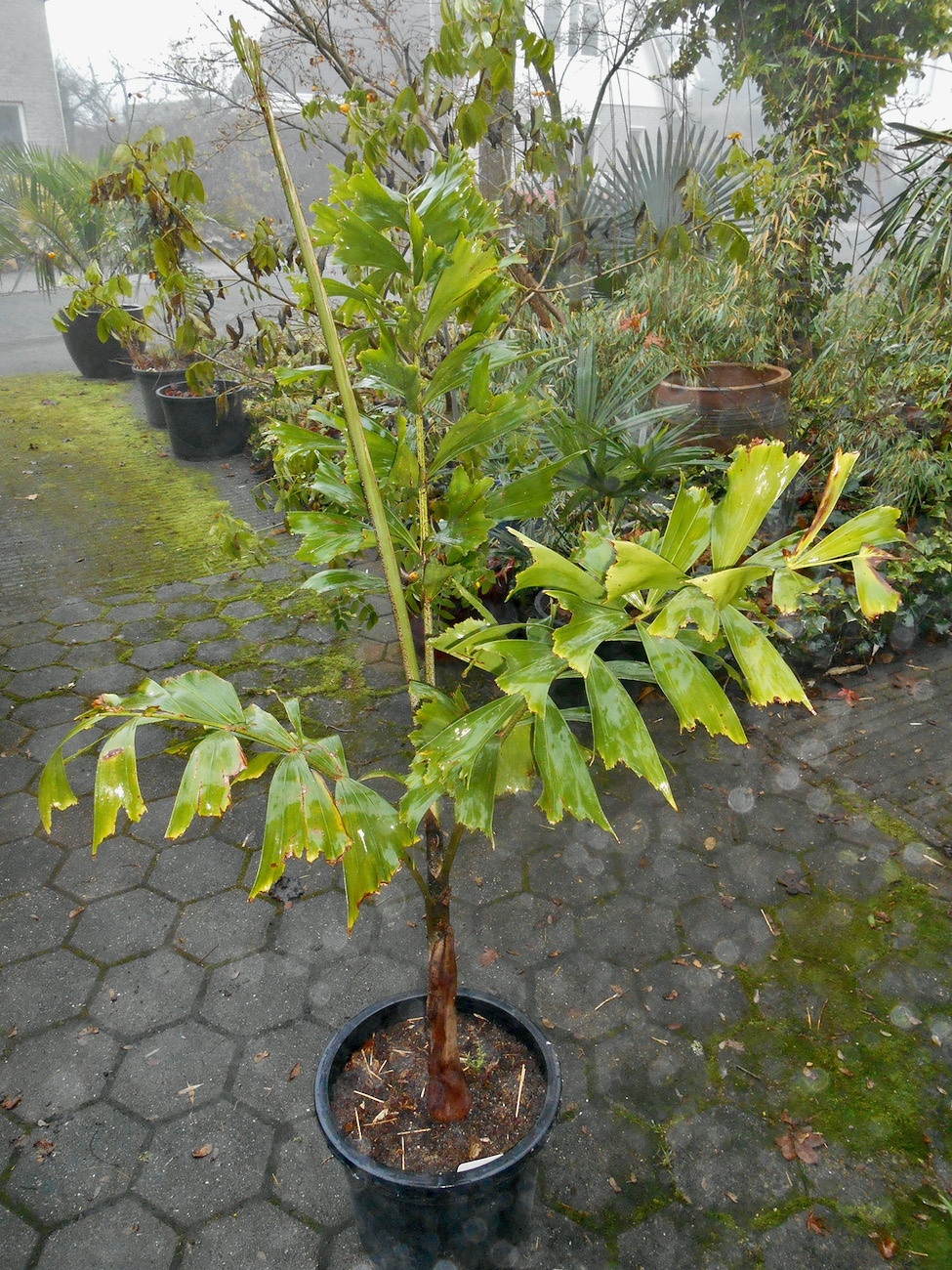 Dit is mijn derde poging om de vossenstaartpalm te kweken. De vorige keren mislukten door het ontstaan van zwarte bladvlekken. In dit exemplaar ontdekte ik vanmorgen wolluis. Deze is voorlopig behandelt met Decis (deltamethrin) en staat nu buiten op te drogen. Het zwaardere geschut blijft voor een later moment gereserveerd. Afgelopen zomer is Hyophorbe verschaffeltii systemisch behandeld met Admire en tot nu blijft de wolluis uit zicht.
