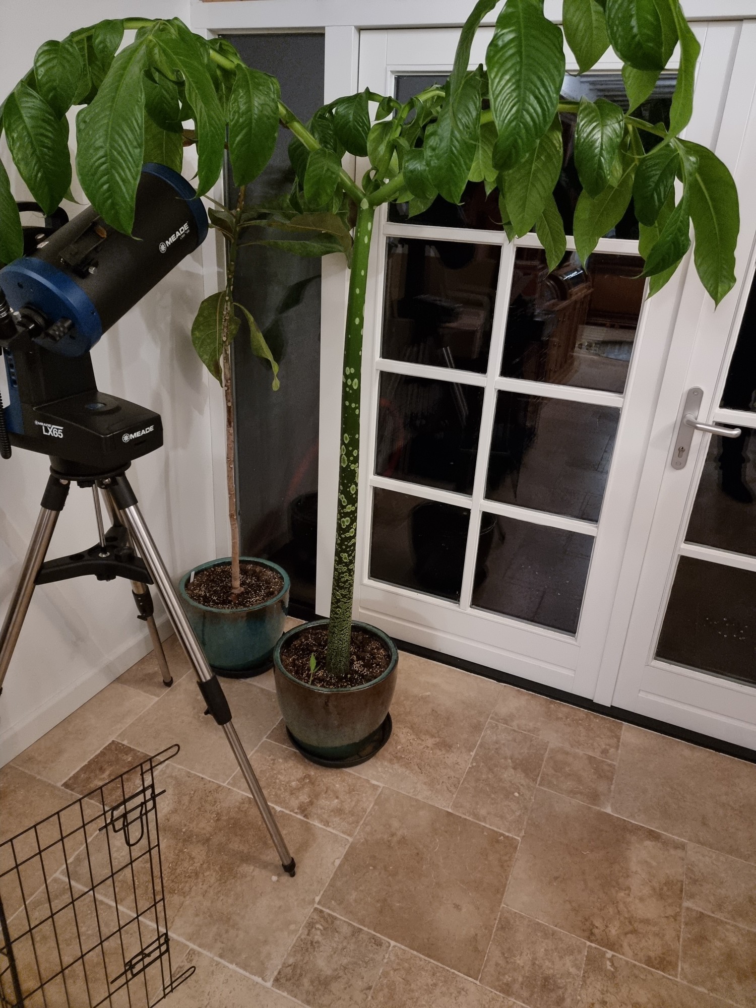 Een andere plant die erg makkelijk is in de huiskamer is Titan arum (zie foto hieronder). Dit exemplaar is nu vijf jaar oud. De plant is nu 220cm hoog en het huidige blad is zijn derde blad. Ieder blad blijft zo'n anderhalf jaar zitten en vervolgens heb je een half jaar een lege pot. De knol is nu ongeveer het formaat van een handbal. Ondanks de tropische herkomst zijn ze niet gevoelig voor droge lucht en er is ook nog nooit ongedierte in gekomen. De bladeren blijven altijd fris groen.