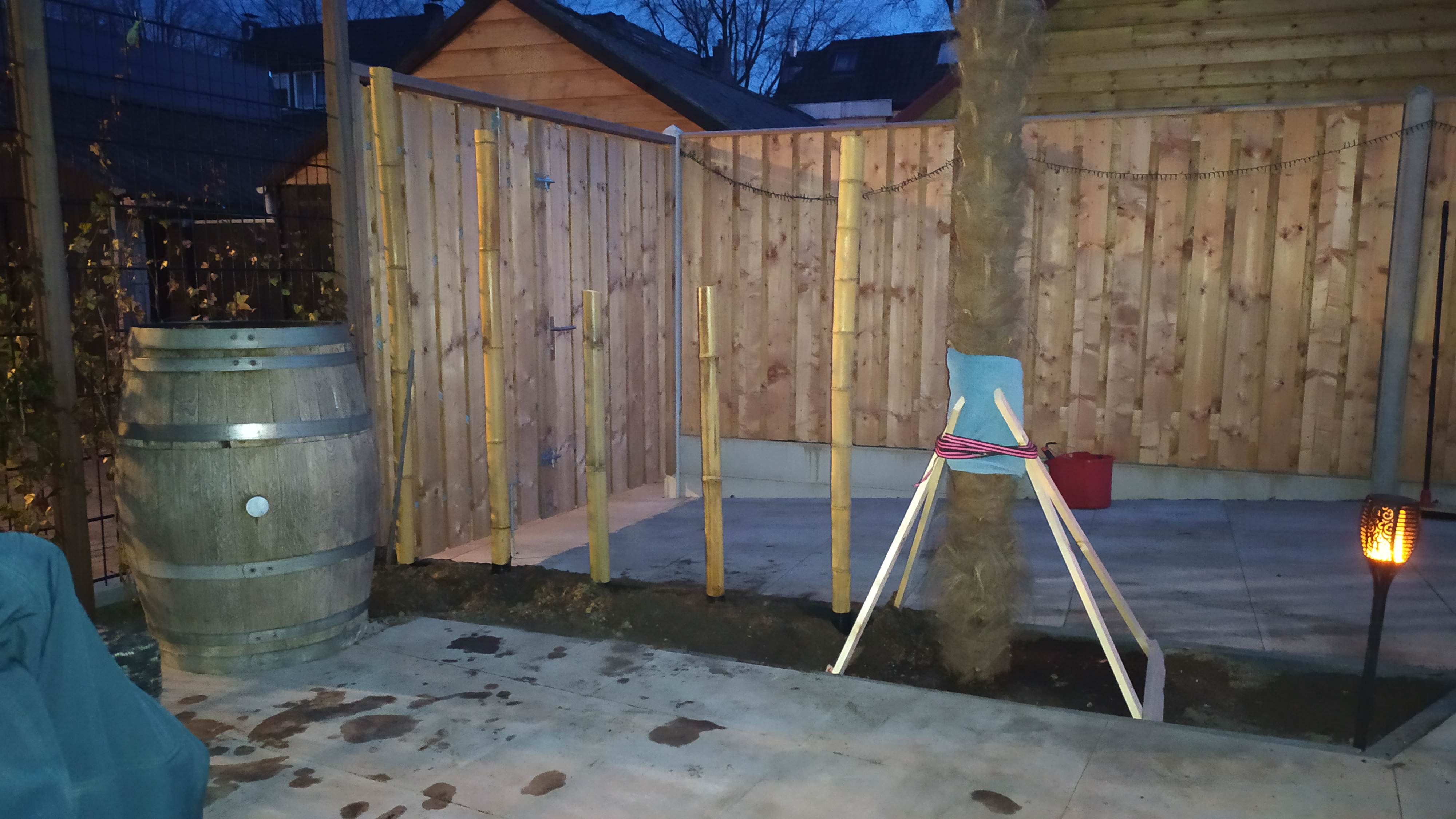Vandaag na het avondeten wat bamboe palen ingegraven in de grond, als afscheiding van de oprit. Bamboe leek ons het materiaal bij uitstek voor de tropische invloed :D .