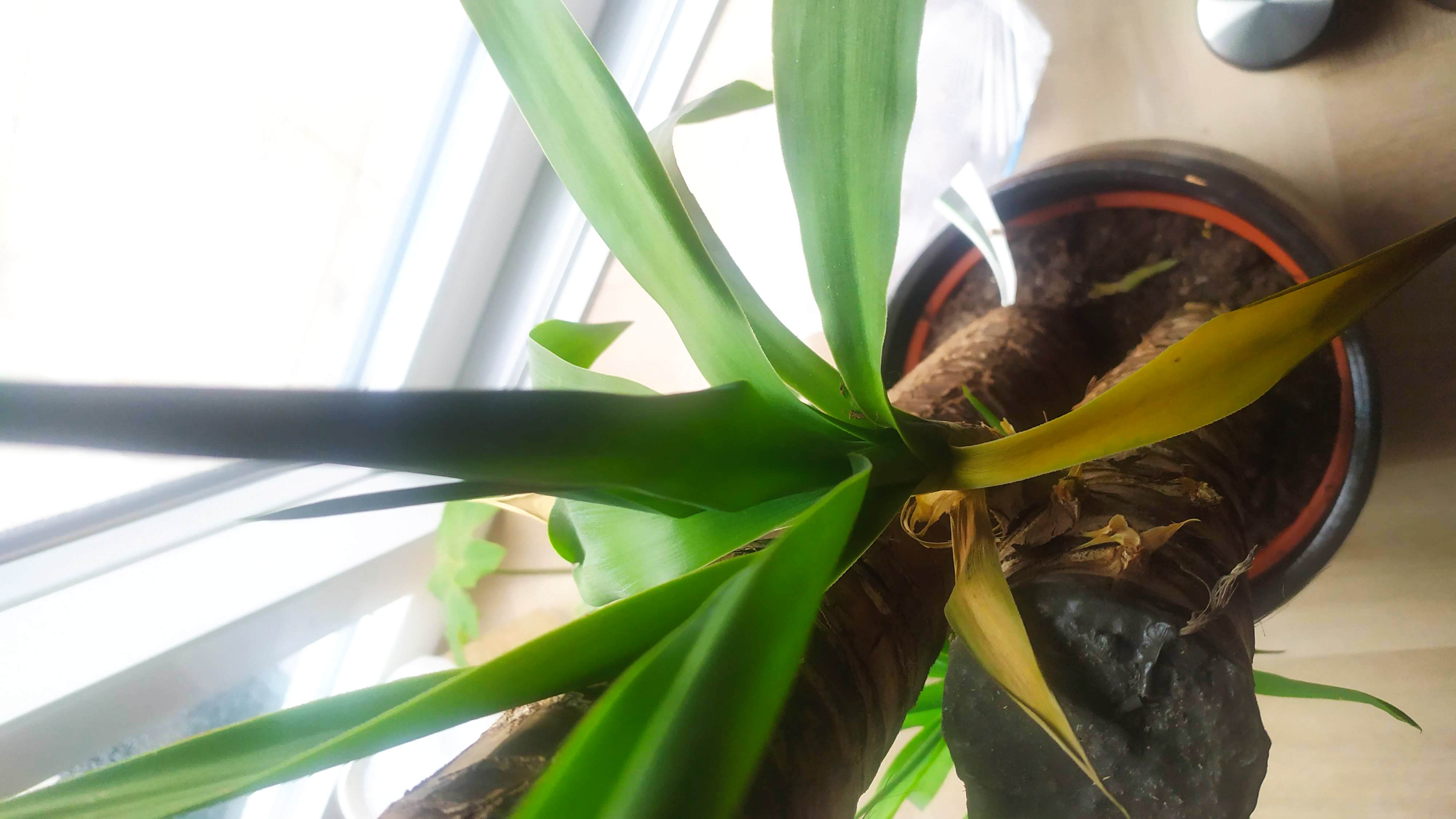 Re: 3 stammige yucca in de woonkamer, 1 stam sterft af???