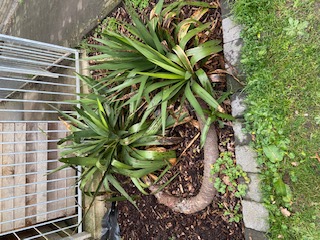 Dit lijkt mij een kamerplant-yucca, Yucca elephantipes. Die zijn niet winterhard. Ze kunnen wellicht een paar graden hebben, maar na afgelopen winter is dit teveel denk ik. De schade wordt nu langzaamaan zichtbaar nu het iets warmer wordt. Hoe lang staat ie daar al?