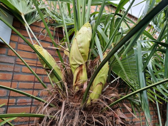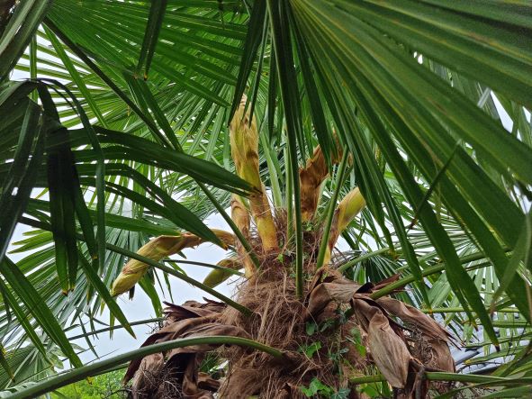 Ik verwacht voorlopig geen bloei in de princeps. Ze groeien hier erg traag, de eerste lichting die een jaar of vijftien geleden via GP beschikbaar kwam. De 'hybride' Trachycarpus (x takaghii) die tezelfdertijd werd geplant, komt nu voor het tweede jaar in bloei (mnl.). Inmiddels raakt de tuin bezaaid met nakomelingen van fortunei 'Winsan' x wagnerianus.