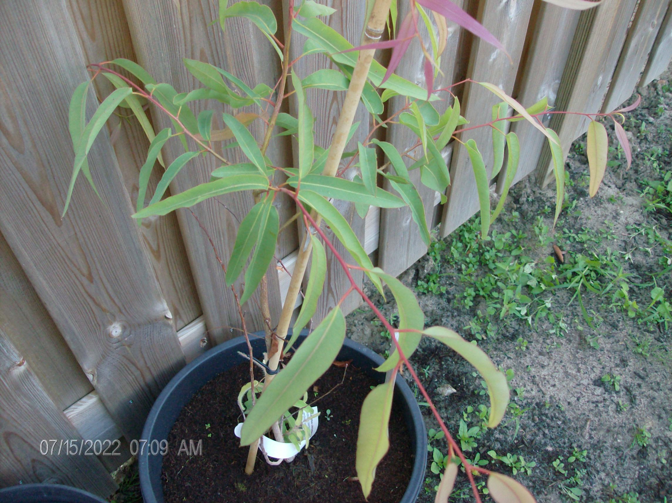 Eucalyptus camaldulensis; eerste jaar in een grote kuip (90 liter) gehouden en enigszins beschut neergezet. Vorige zomer is hij 2,5 meter gegroeid! Afgelopen winter is het ook goed gegaan. Inmiddels heb ik ze gesnoeid en verplaatst naar de volle grond. Het duurde even voor de groei weer op gang kwam, maar inmiddels groeit hij weer lekker.