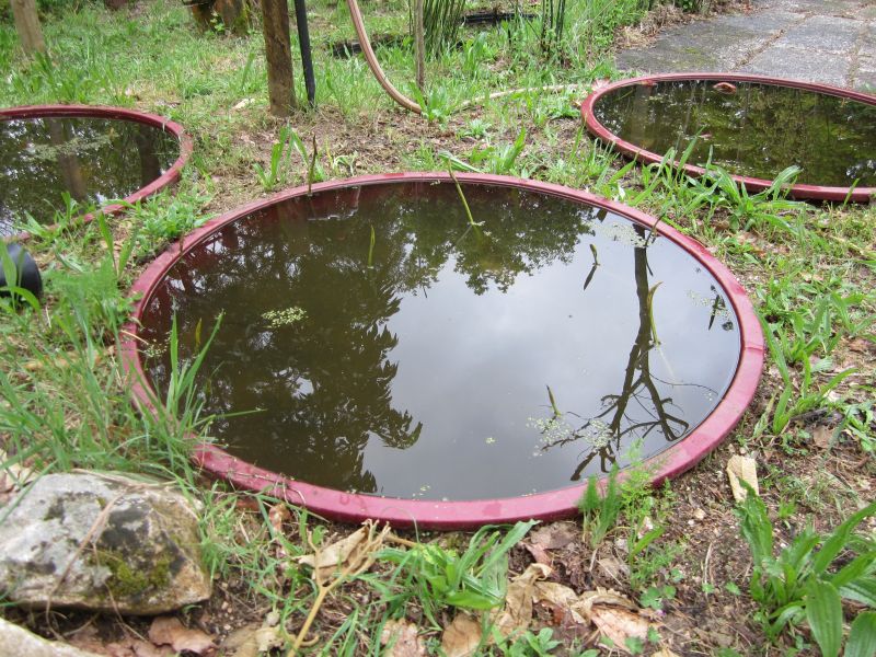 De lotussen (komarovii, lutea en een tropische rode nucifera) beginnen voorzichtig uit te lopen.