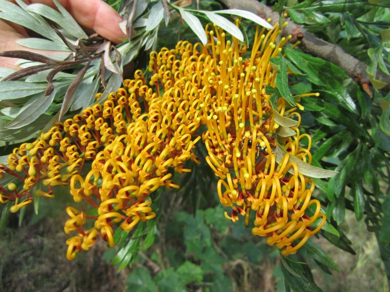 de Hippeastrum in bloei en de Grevillea robusta met bloemen. Dit jaar heeft hij ook bloemen aan de laagste takken dus kan ik wat betere foto's maken.