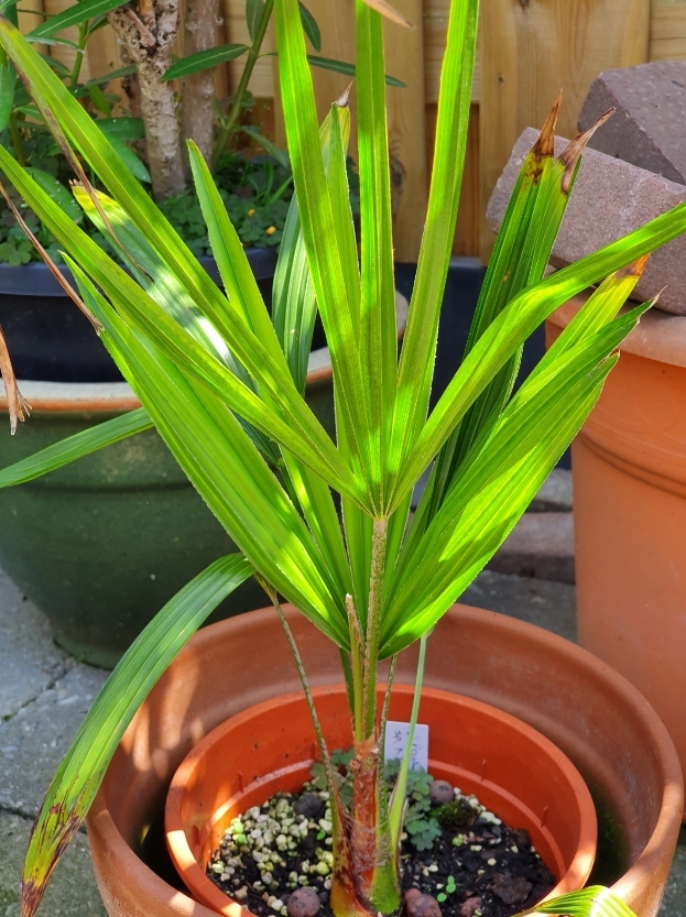 Heb deze Brahea geloof ik al 10 jaar ofzo. Is één grote wortelkluit. Heb m vorig jaar in grotere kuip geplant, en groeit nu weer goed. Stammetje zo'n 30 cm nu.