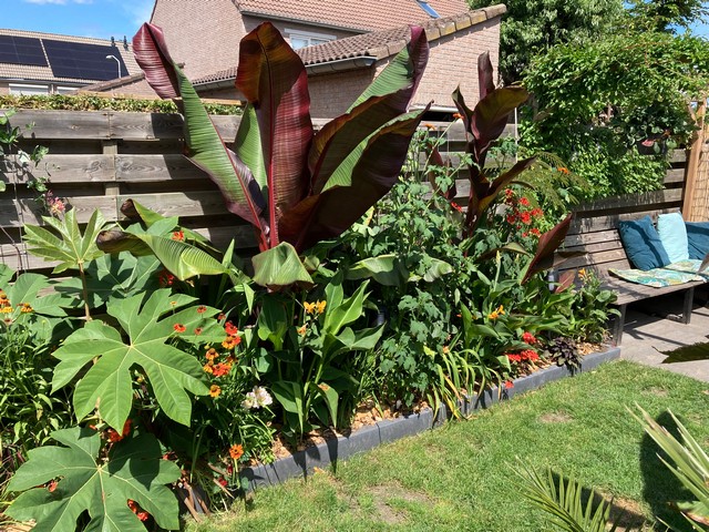 Rondom het terras is er duidelijk voor minder exotische planten gekozen om mijn wederhelft gelukkig te houden.