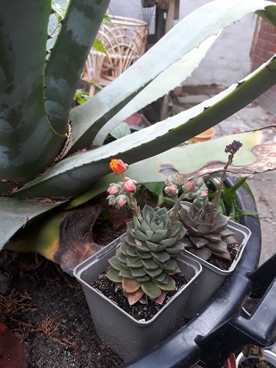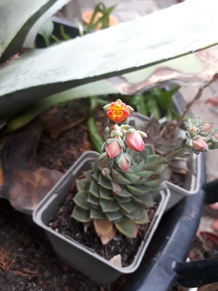 Dit is ook leuk. Intussen zijn we sinds het maken van deze foto's alweer anderhalve maand verder, maar de Echeveriabloemen zijn nog altijd mooi en de Aloe ernaast is intussen ook bezig een mooie bloeiwijze uit te vouwen. Die zal ik binnenkort even kieken als ze open gaat.
