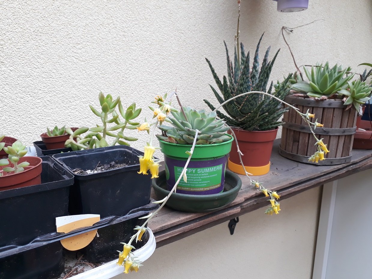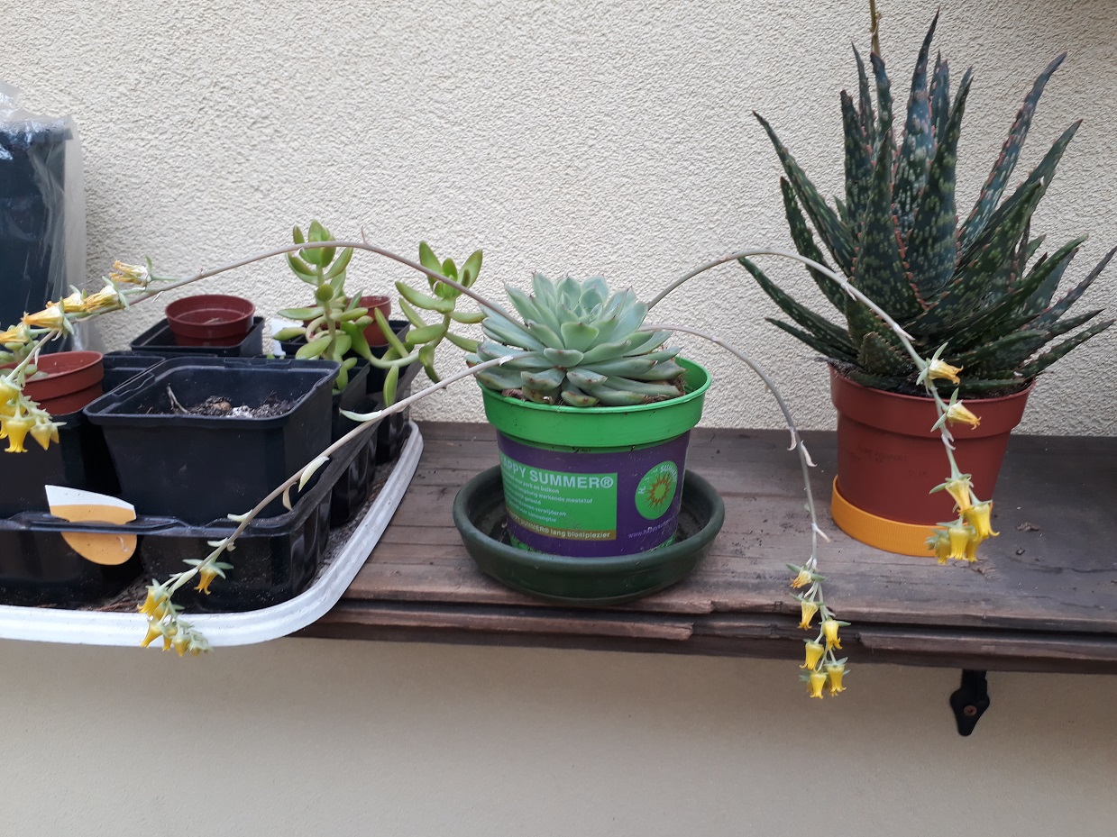 In mei heb ik even een foto geschoten van twee Echeveria's in de veranda, waar ze droog en niet geheel vorstvrij hebben overwinterd. Volgens etiket zijn het "green gilva" (op de voorgrond) en "purpusorum" (op de achtergrond). De bloeiwijze is later nog veel groter en mooier geworden, maar daar heb ik geen foto's van. De Purpusorum heeft later identieke bloemen gekregen als deze green gilva. Ik was blij verrast, vond het bijzonder mooi.