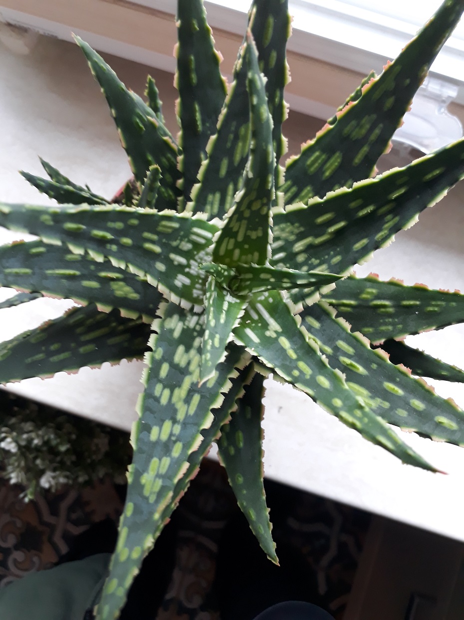 Hij heeft een beetje een licht blauwige waas op de bladeren maar volle zon vindt ie toch niet zo fijn. Hij verkleurt dan zoals meerdere Aloë's wat roodachtig en verbrandt hier en daar.