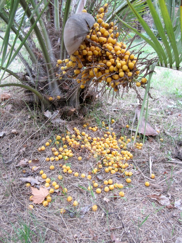 De Butia capitata die ik 11jr geleden als klein p9-plantje meenam uit NL geeft de laatste jaren vruchten in de herfst. Dit jaar is de oogst heel ruim. Zie foto's. De palm is nu circa 2m hoog en breed en begint zich nu bijna te strekken.