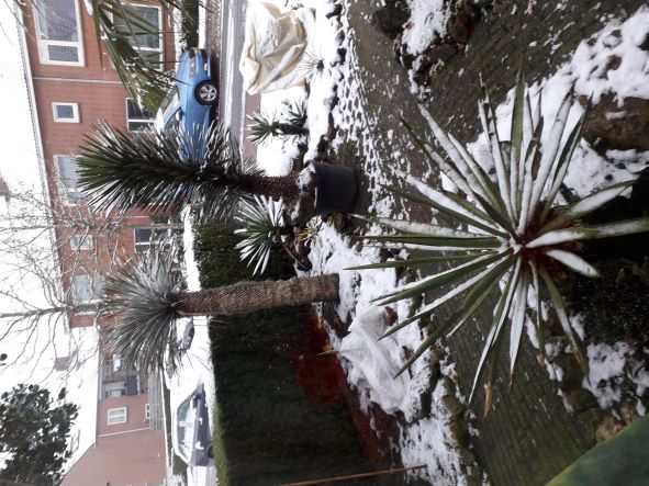 Ondanks de washingtonia ongeveer -7 a -8 graden vorst gehad heeft ziet hij er nog niet verloren uit