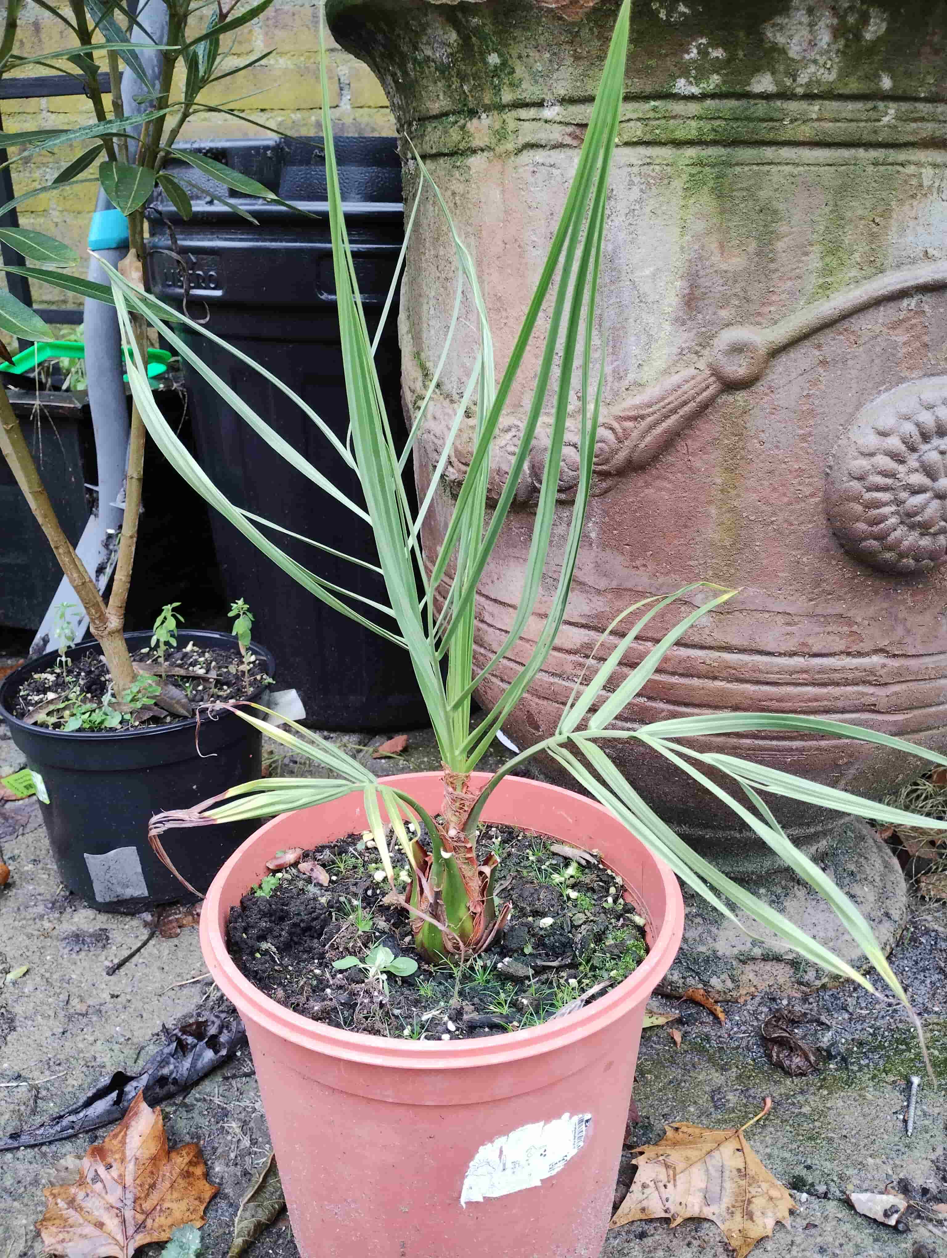 De butia hier gaat de laaste jaren echt vreselijk hard, haalt zelfs qua groeisnelheid bijna de canariensis in, helemaal qua stamaanmaak. Gekocht als Yatay maar dat is niet logisch vanwege de beharing, dus ik denk odorata vanwege de blauwige tint. Kneiterhard en niet gevoelig voor vocht icm vorst..heeft in het verleden genoeg dagen een snijdende oostenwind om de oren gehad maar het blad bleef gewoon mooi.