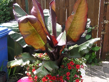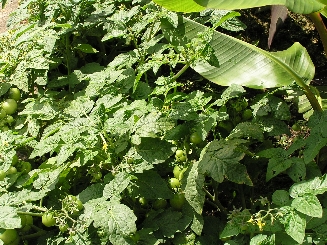 kleinste vak met donkerbladige canna,musa velutina en musa ? op de voorgrond laagblijvende snoeptomaatjes
