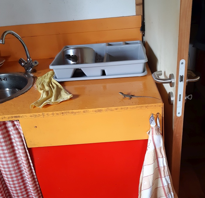 2-we hadden een bezoeker in ons keukentje: een Spaanse muurhagedis! Zie foto's. Prachtige beestjes die bij ons graag in het aluminium raamkozijn wonen. Ik heb deze veilig buitengezet omdat we bang zijn er per ongeluk op te gaan staan. Op de foto niet te zien is dat zijn rug behoorlijk groen is.