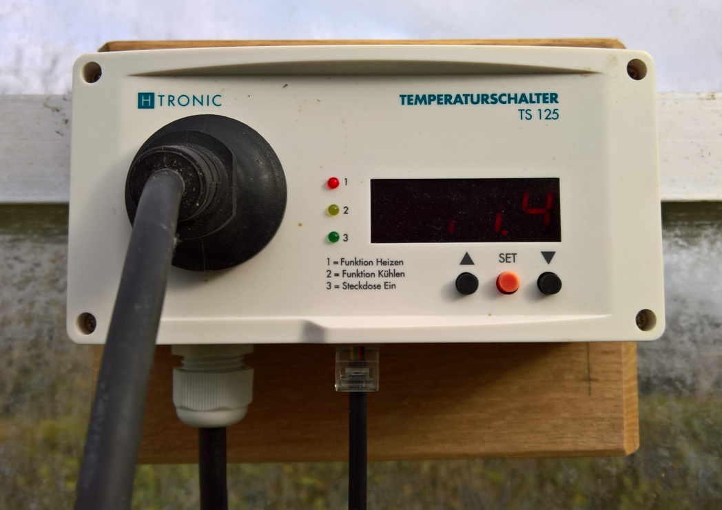Deze thermostaat maakt gebruik van een externe voeler die ik op een plaatje aluminium heb geschroefd om sneller van temperatuur te veranderen. De thermostaat is instelbaar tot op de tiende graad. Hij schakelt een elektrische kachel van 2 kW.