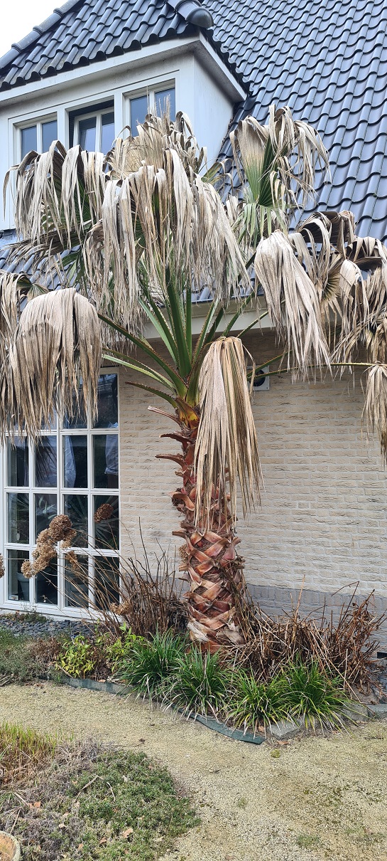 Mijn 3 Phoenixen in 50L potten hebben een groot deel van de koude gezien (meestans onder het afdak in de buitenkeuken), en twee ervan zijn perfect groen en alweer aan de groei.