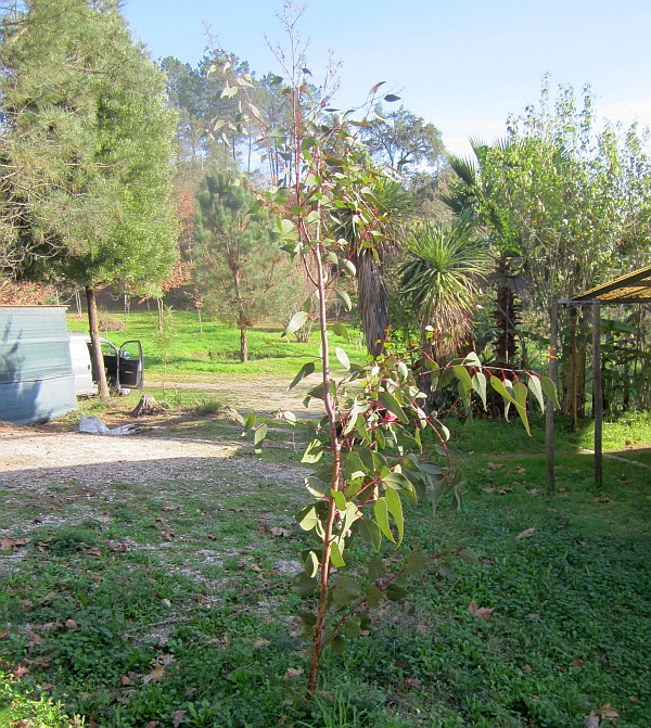 Thans staat te bloeien Eucalyptus caesia. Deze kleine soort bloeit altijd in de winter (ook in Australië). De plant zelf stelt niet veel voor, maar de bloemhoofdjes zijn mooi, en voor Euc-begrippen groot, tot 5cm. De plant is nu 2,5m hoog.