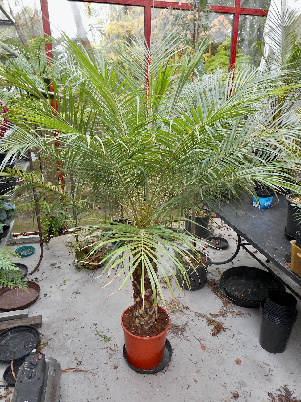 Voorheen lukte het niet om deze fraaie palm vorstvrij te overwinteren. Binnenshuis is vaak geen optie - te omvangrijk of de gevoeligheid voor spint. Sinds 2 winters staat de kasthermostaat hoger op 7°C en dat bekomt de roebelenii beter. Dat geldt trouwens ook voor Howea forsteriana. Voorheen ben ik deze 2 palmen, die lichte vorst verdragen, een aantal keren verloren. Langdurig lage temperaturen i.c.m. hoge luchtvochtigheid verdragen deze palmen blijkbaar niet. Dit positieve resultaat heeft me verleidt afgebeeld exemplaar aan te schaffen. Het is mooie prijs (€ 99) voor deze kwaliteit.