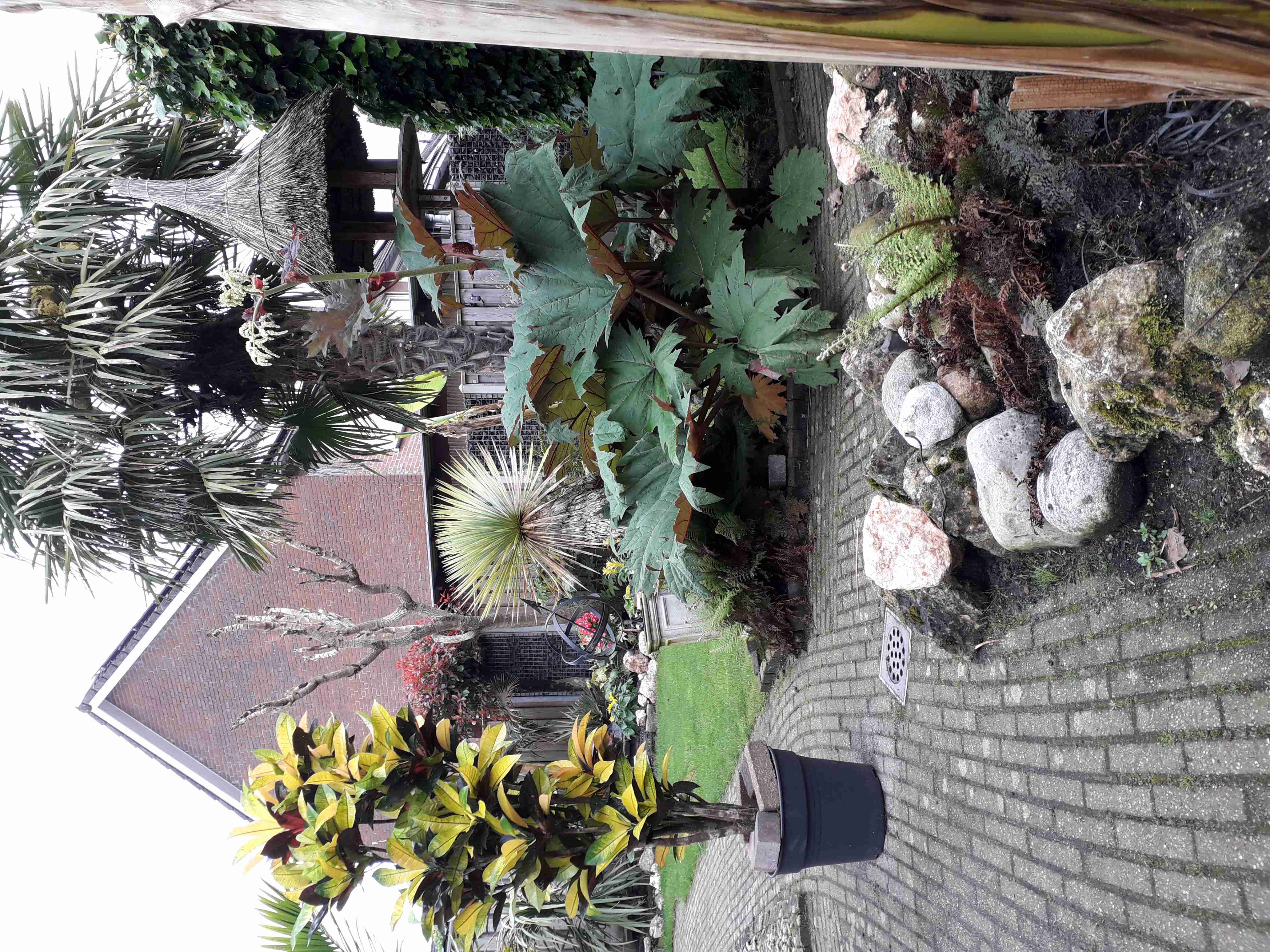 Die rheum is erg fraai Marinus, maar ik denk dat deze palm een Chamaerops is en geen Brahea.