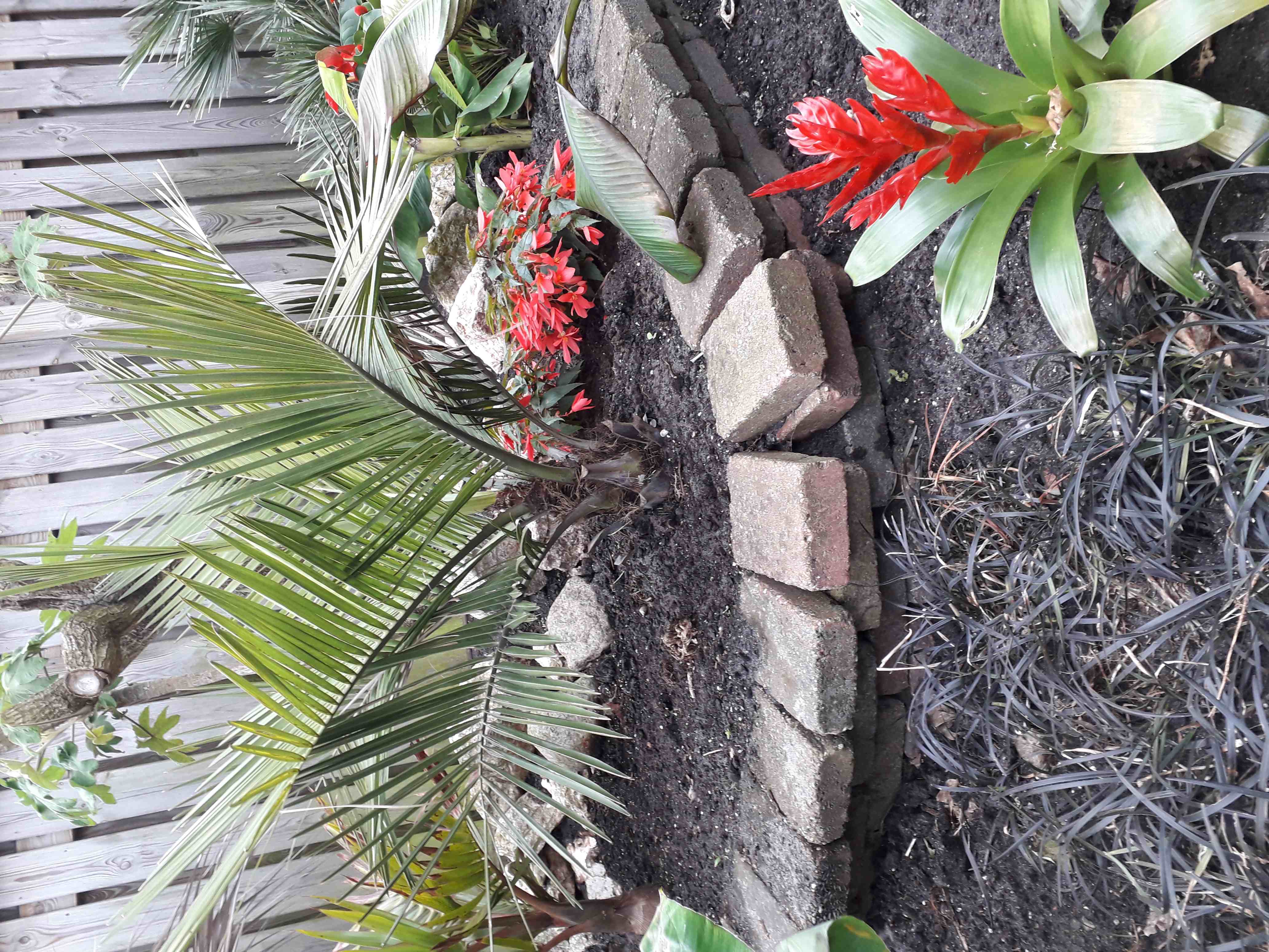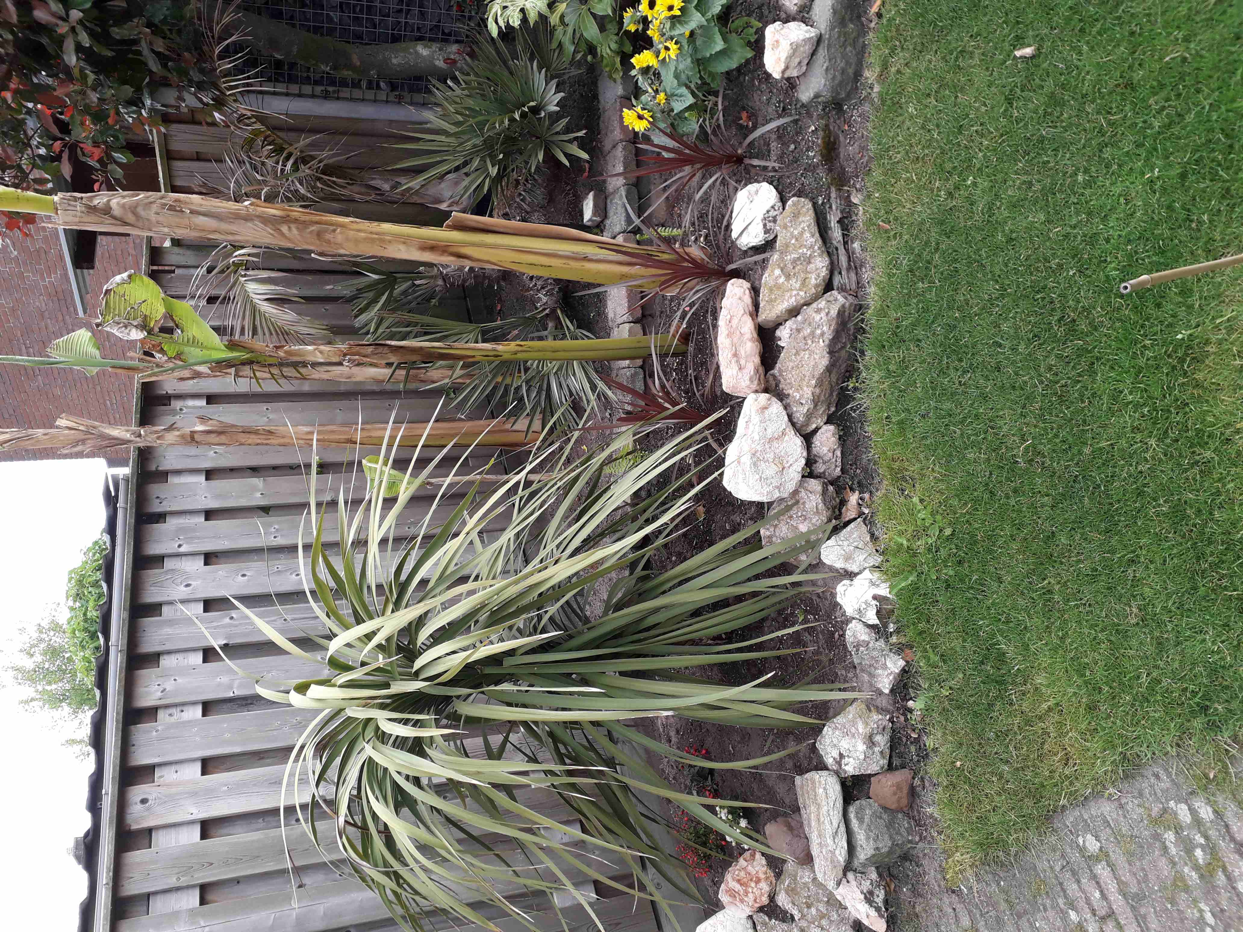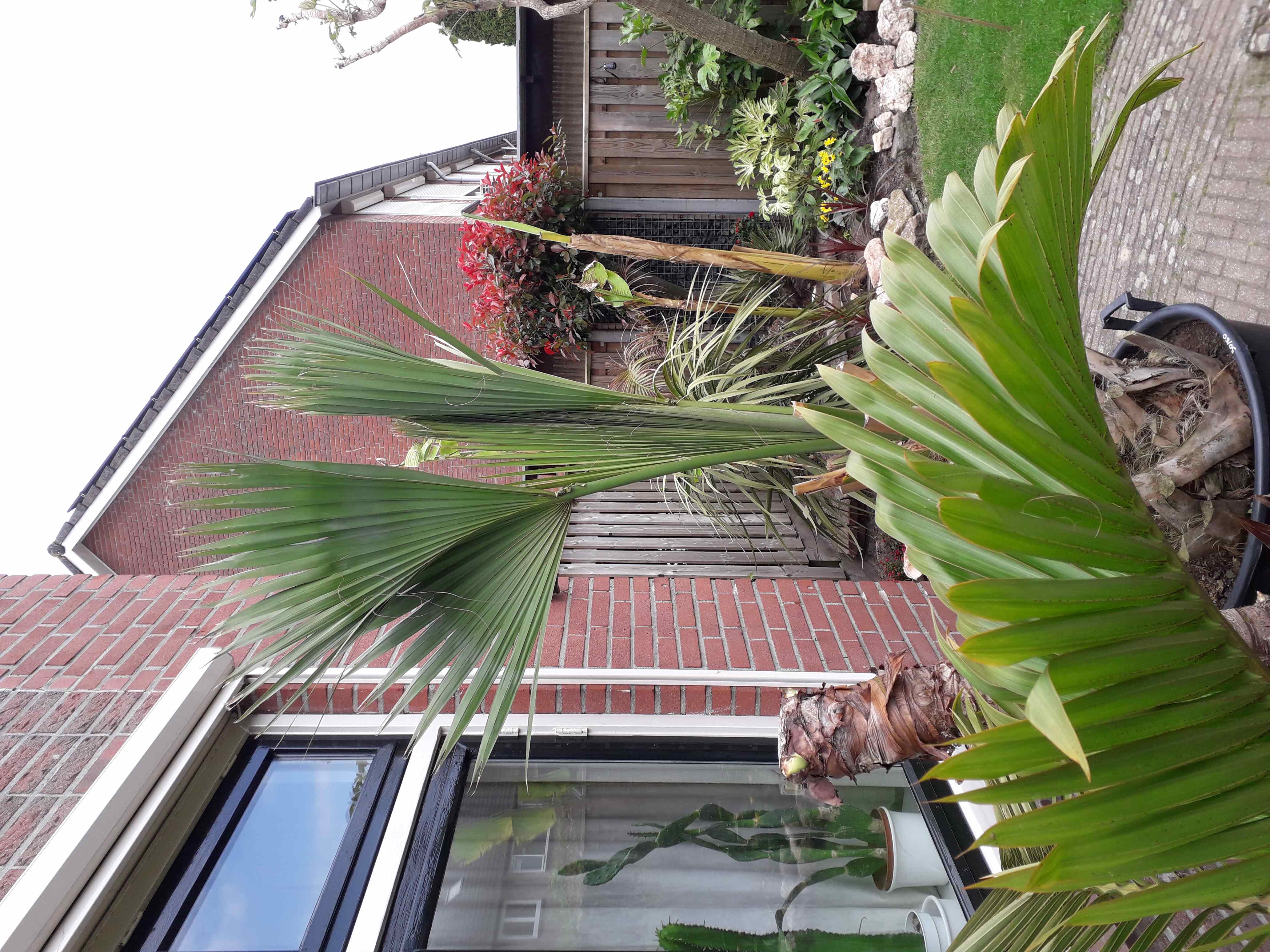 De Sabal minor die ik vorig jaat hebt aangekocht, heeft 4 bladeren, waarvan 2 de bladeren wat geknakt waren staat er weer goed bij. Ongeveer 2,50 meter hoog.