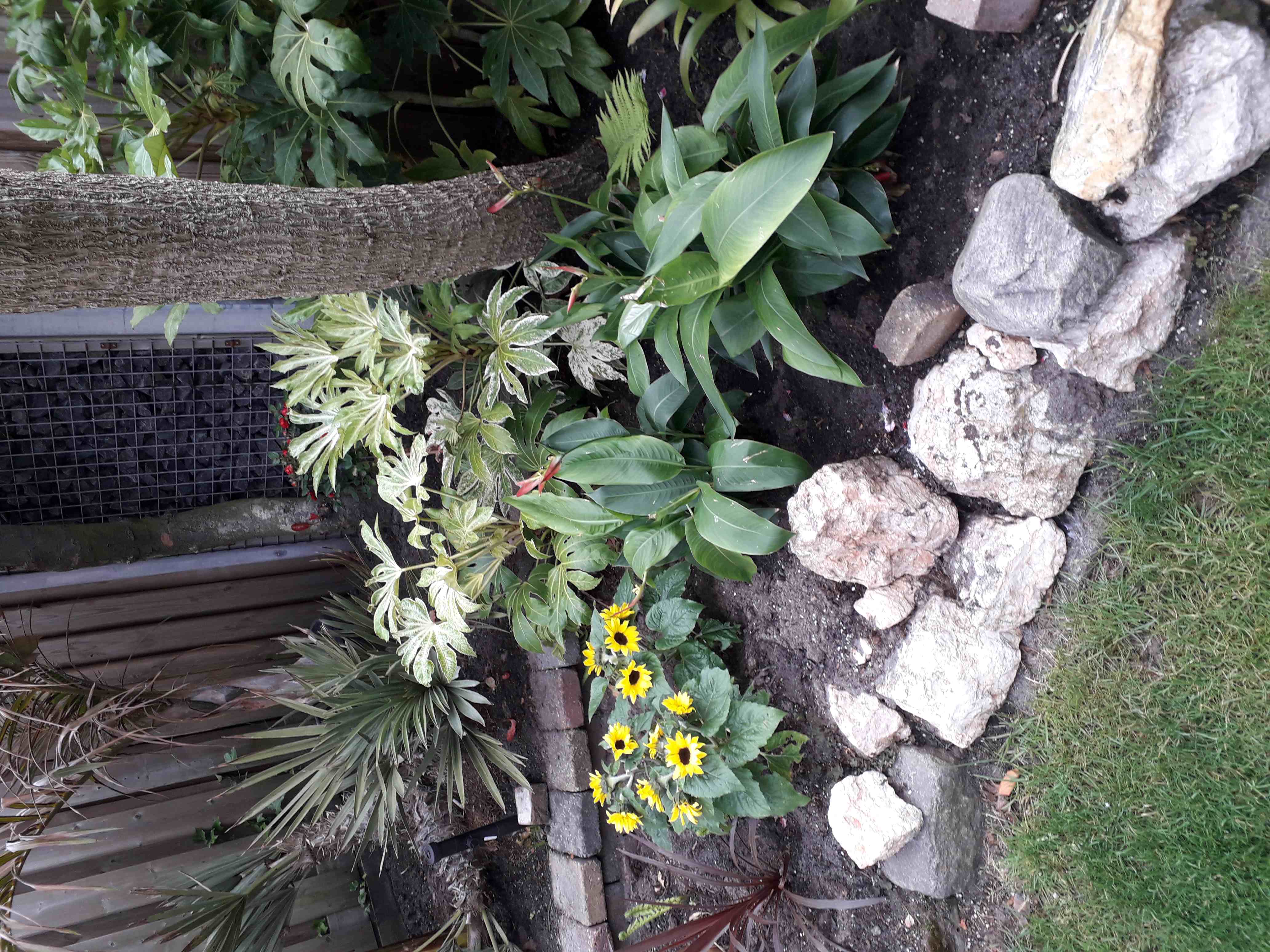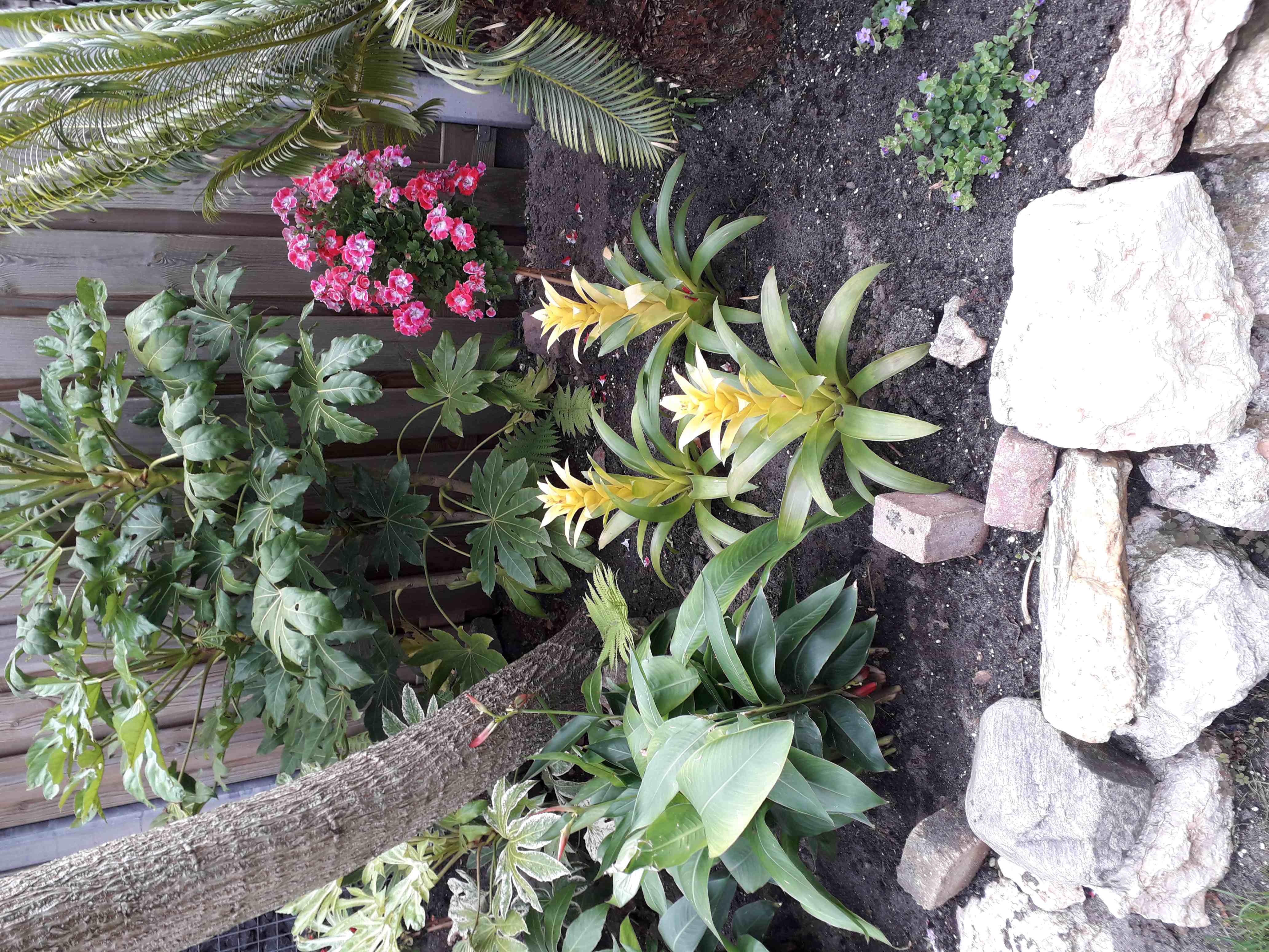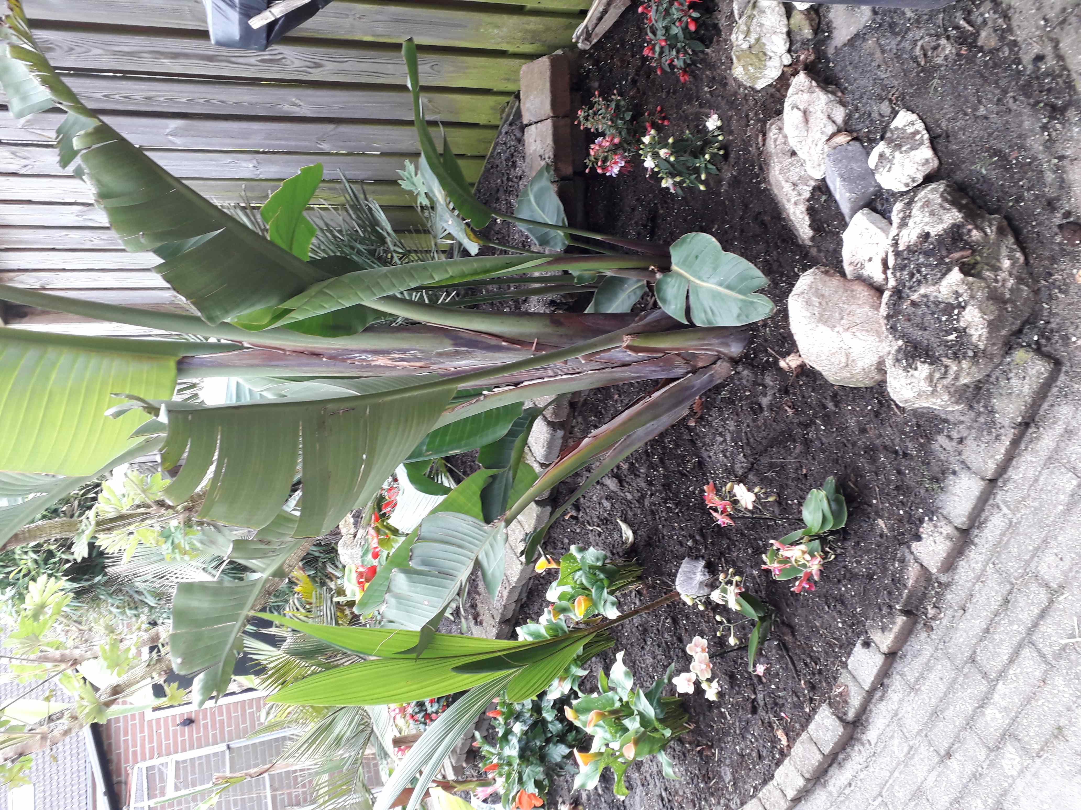 De Sabal minor die ik vorig jaat hebt aangekocht, heeft 4 bladeren, waarvan 2 de bladeren wat geknakt waren staat er weer goed bij. Ongeveer 2,50 meter hoog.