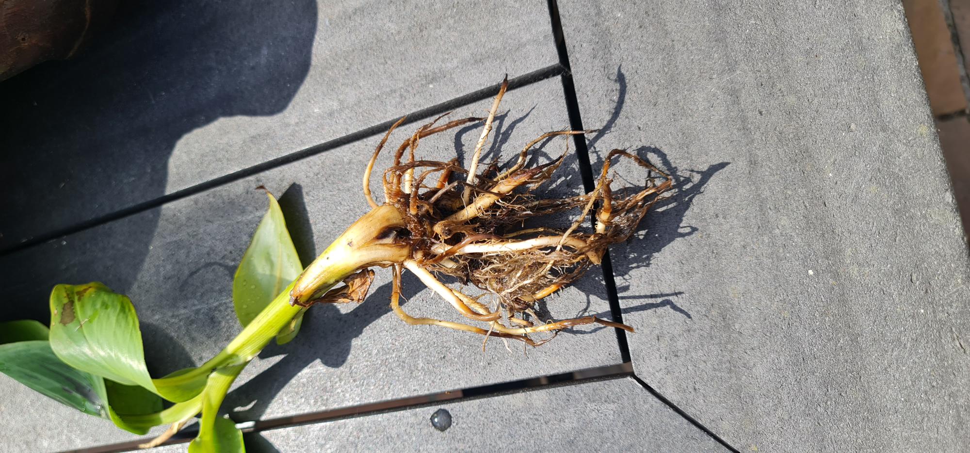 Inmiddels heb ik de bruine wortels weggeknipt en hem weer in de pot gezet, uit de zon.