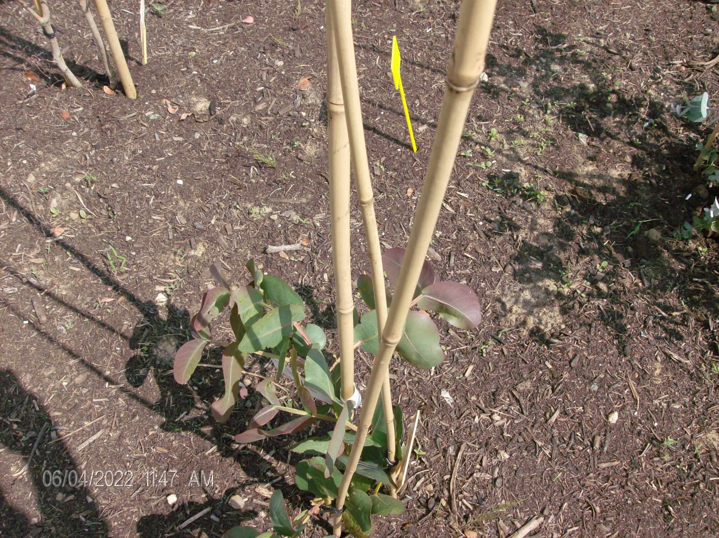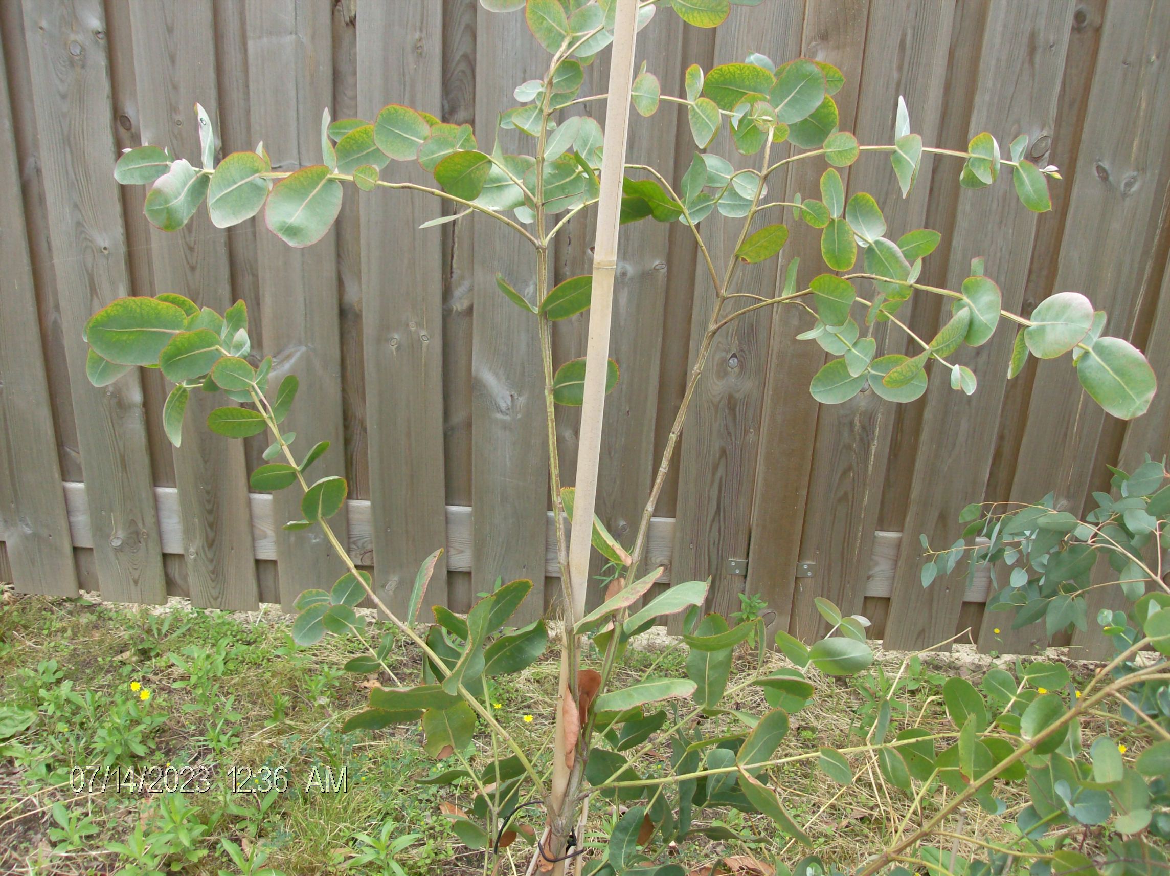 Enkele foto's van de ontwikkeling van onze Eucalyptus neglecta 01, 02 en 03 tussen 04-06-2022 en 05-08-2023: