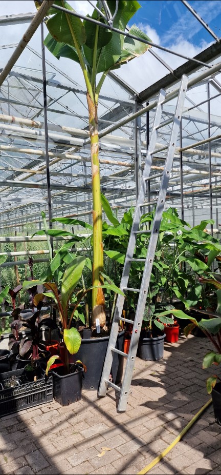 Helaas een super lange slechte lente gehad, banaantjes kwamen wel maar niet om verder te groeien, temperatuur, zelfs in de kas te laag gebleven.