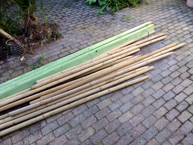 De eerste palen zitten in de grond. Deze worden via de horizontale lat, laatste foto, vastgemaakt aan de betonplaat. De palen zelf nog een met ijzeren draad aan de betonpalen.