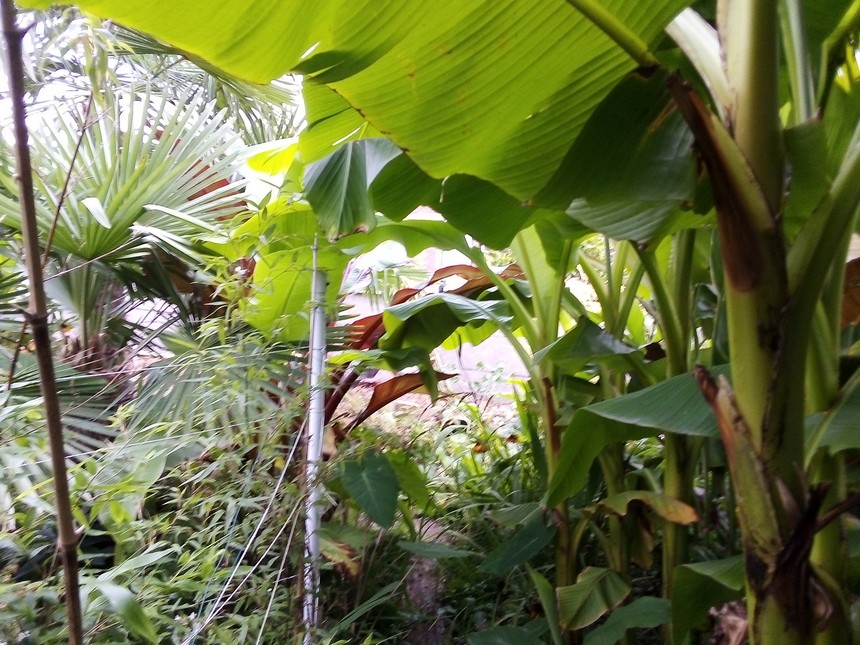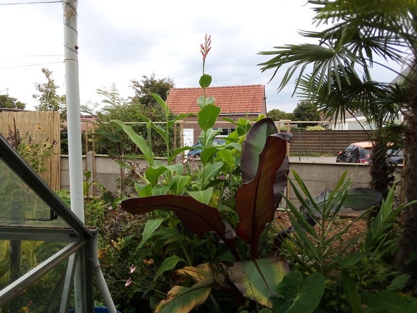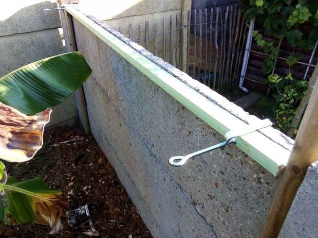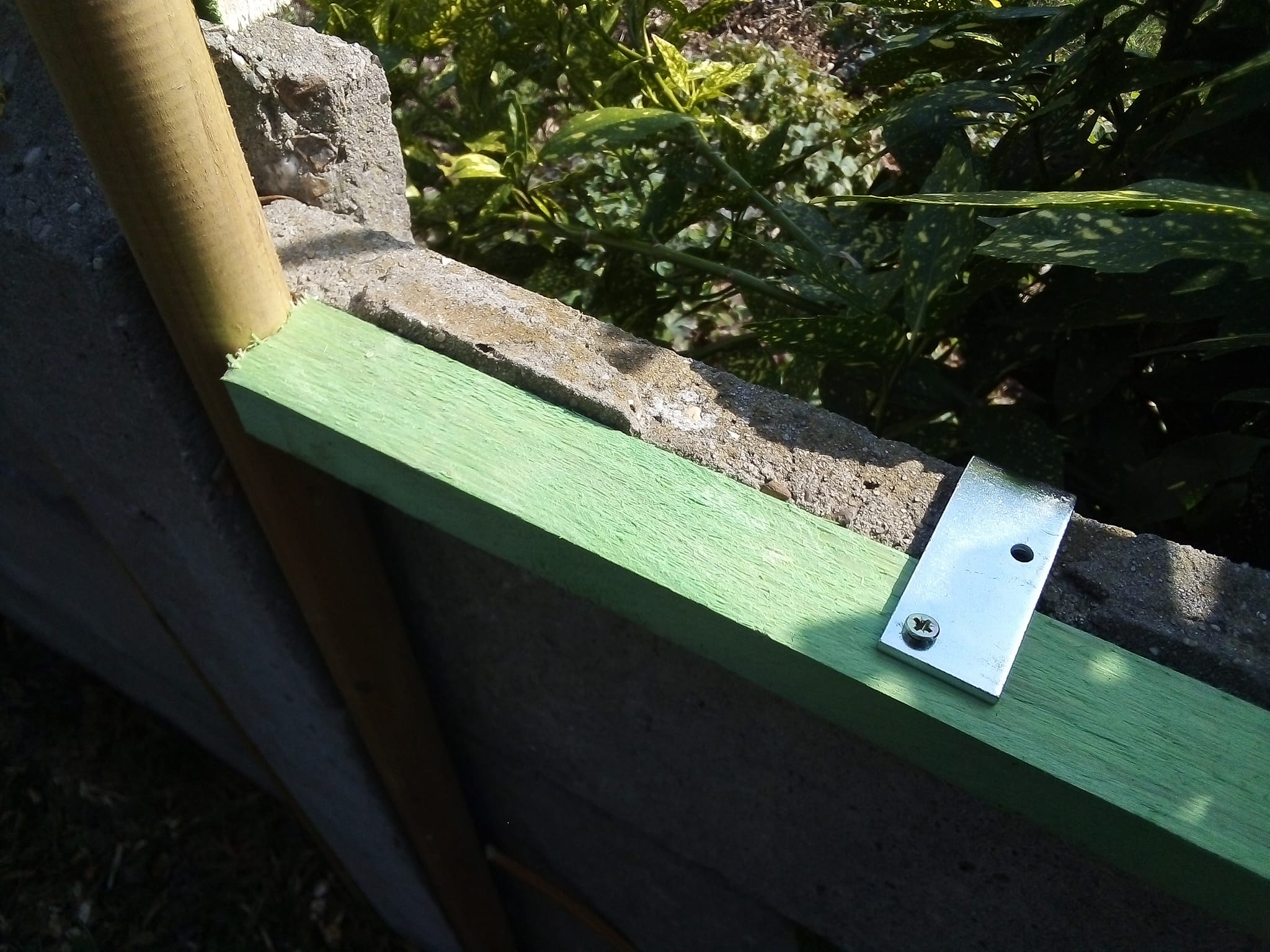 Ja sorry mensen nog geen foto's van planten. Constructie bamboescherm gaat eerst door. Tot 12hr vandaag wat gedaan in volle zon en is echt niet te doen maar heb toch het basisframe klaar. Je kan nu ook zie waarvoor ik die hoekverbinding nodig had. Volgende week nog een dikke draad spannen tussen alle palen zodat ook daar de mat bevestigt kan worden.... Kon het niet laten in loeiwarme hitte toch snel 1 mat gezet