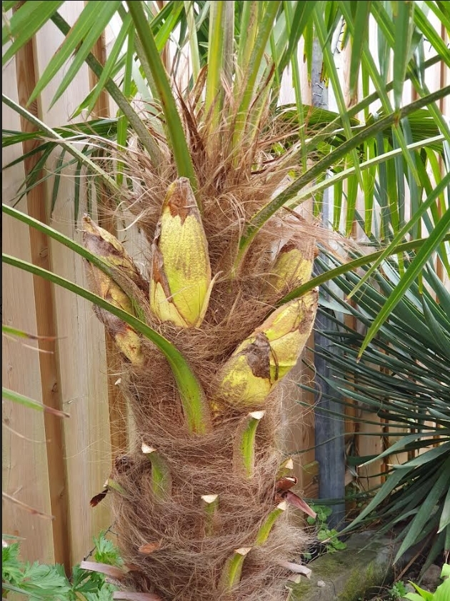 Nog niet eerder zoveel bloemknoppen in mijn Trachycarpus gehad.