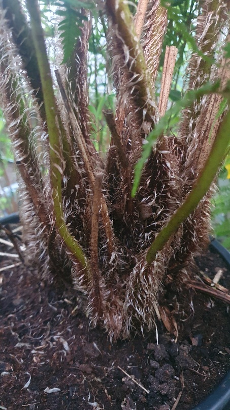 Daarnaast twijfel ik of dit in plaats van een zogenaamde grote stam niet meerdere boomvarens in 1 pot zijn.